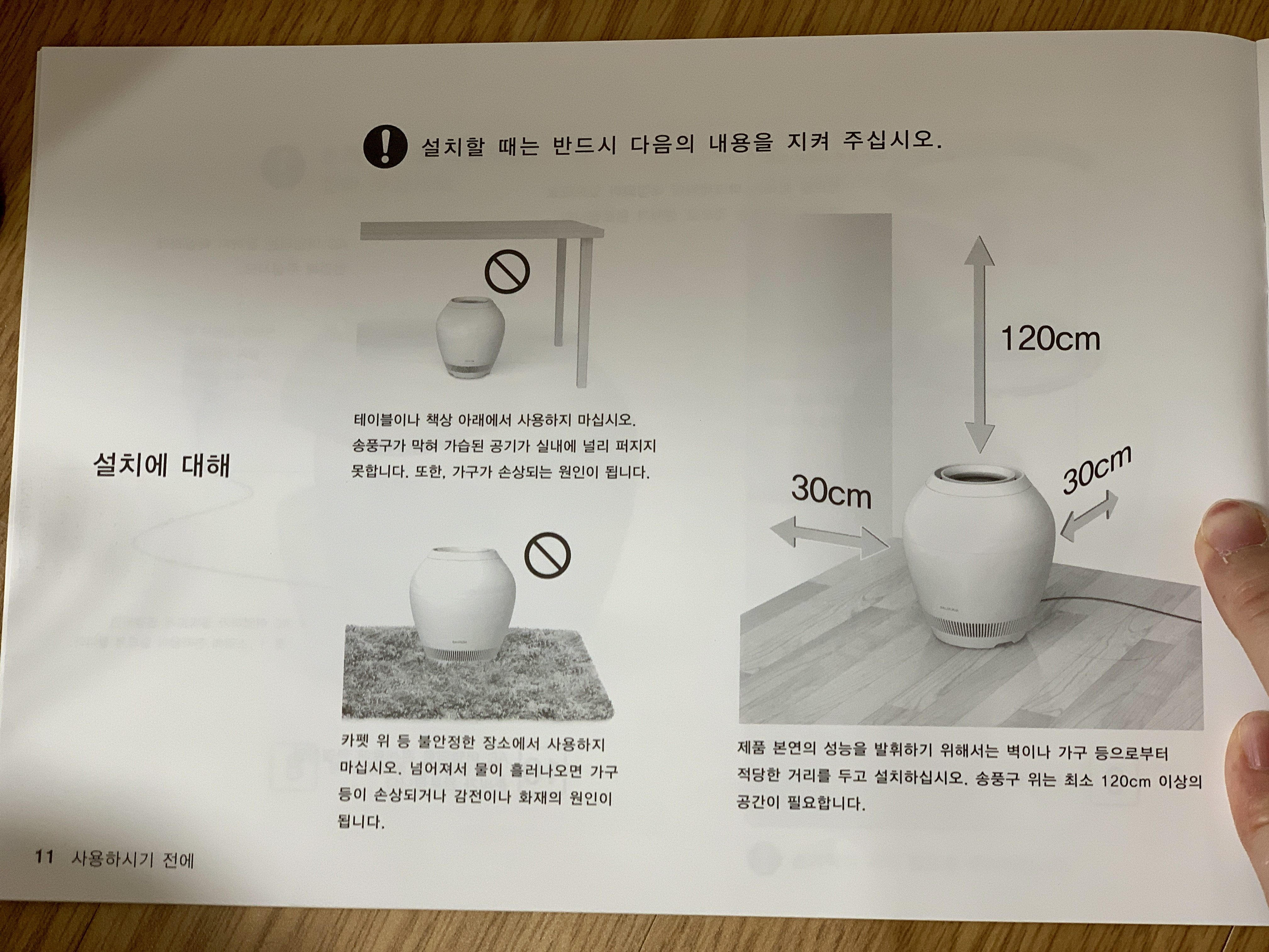 ▼ 설치 시 아래 내용들을 지켜달라고 하네요. 특히 설치 시 가습기를 벽에서 30 cm는 떨어뜨려야 한다고 합니다. 아무래도 가습기다 보니 벽지와 떨어뜨리는 것 때문에 그런 것 같네요.