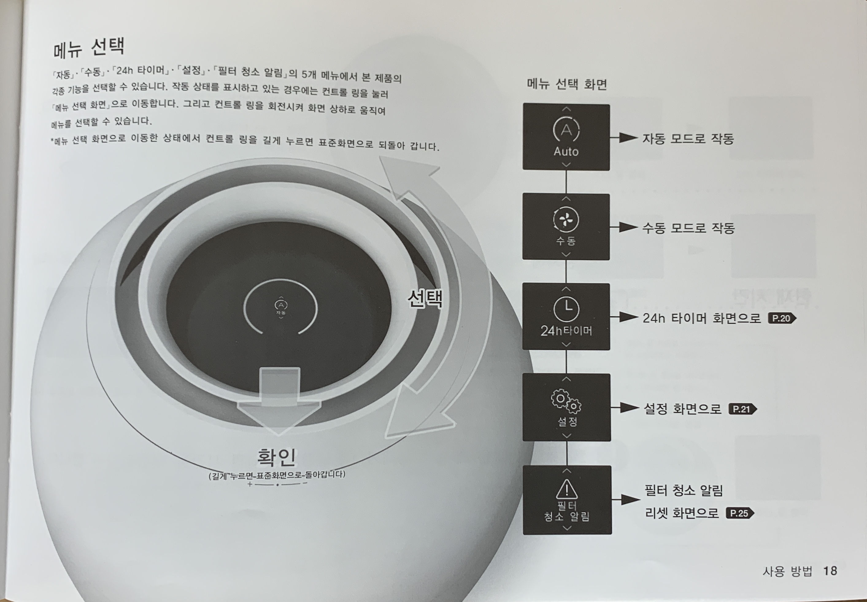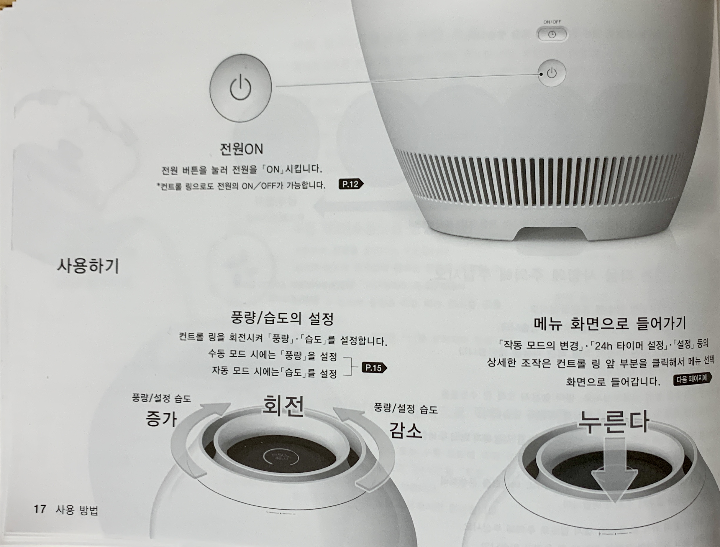 ▼ 메뉴를 선택하는 방법은 조금 낯설 수 있습니다. [컨터롤 링]을 누르고 돌리면 메뉴가 선택되는 방식입니다. 아래 영상을 보시면 [컨트롤 링]으로 어떻게 가습기를 조작하는지 확인하실 수 있습니다.