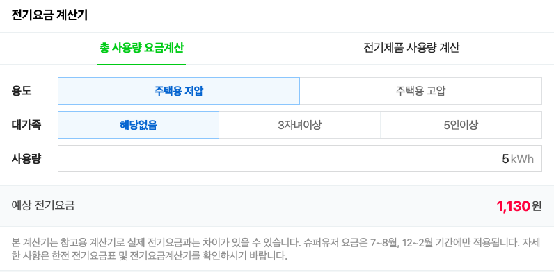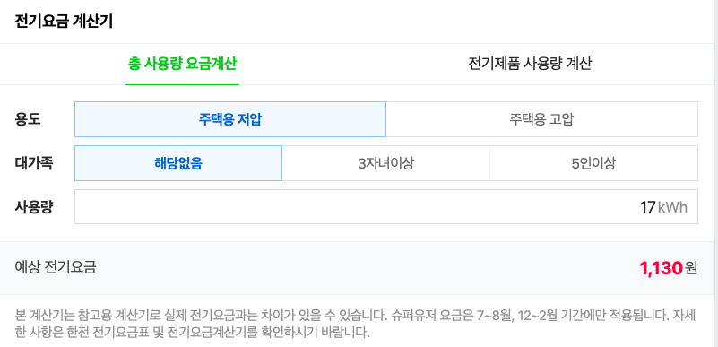 ▼ 사용량 입력에 소숫점은 입력이 되지 않아 5kWh과 17kWh를 각각 입력해 보았습니다. 금액이 모두 1,130원이 나오네요. 아마 최소 금액으로 나오는 것 같습니다. 각 가정에서 사용되는 전력량에 추가해서 계산해야 정확히 알 수 있을 것 같네요. 이번 달에 사용해보고 저번달과 비교해 보았을 때 얼마나 차이나는지 확인해 봐야겠네요.