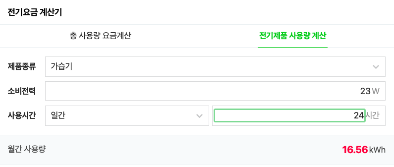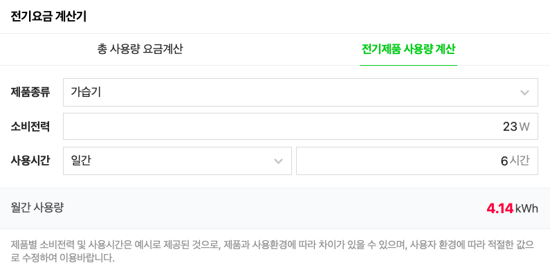 ▼ 네이버에서 전기제품 사룡량 및 요금을 계산해 보았습니다. 먼저 사용량에서 가습기를 선택해보니 가습기는 일간 6시간을 사용한다고 설정되네요. 평균적으로 6시간 정도를 사용하는 것 같습니다. 5단계로 6시간씩 계속 사용한다고 계산하였을 때 월간 총 4.14kWh가 계산되네요. 24시간 돌린다고 가정하면 월간 16.56kWh가 나오네요.