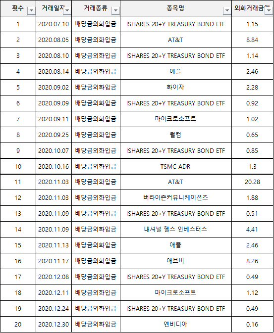 ▼ 2020년도 배당 실적은 아래와 같습니다. 총 20회의 배당금이 입금되었습니다. TFT같은 경우는