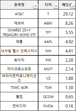 ▼ 가장 많은 배당을 받은 종목은 단연 AT&T입니다. 배당률 약 7%에 달하고, 배당 성장 년수도 36년에 달하는 귀족주에 속합니다.