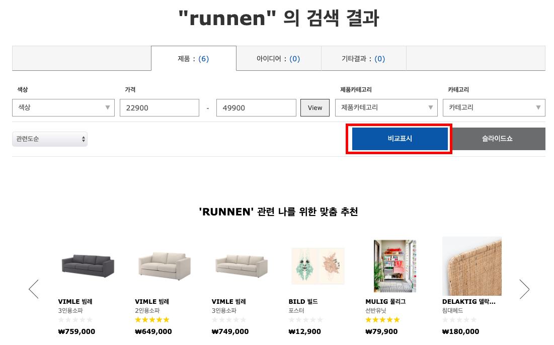 비교하고자 하는 제품에 마우스를 올리고 [제품비교] 버튼을 클릭한 다음 상단에 [비교표시] 버튼을 누르면 비교가 가능하다.