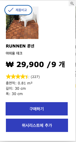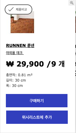 베란다 발판도 그 중 하나이다. 접시들고 슬리퍼 신고 들락달락 할 생각을 하니 도저히 베란다 설치는 생각도 못 하겠어서, 바로 발판 설치를 알아보았다. 기본적인 조립식 발판도 많았지만 평소 이케아 물품을 자주 사고, 요즘은 이케아 온라인몰에서 이것 저것 구경도 가능하여 이케아에서 알아보기로 했다.