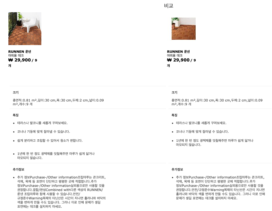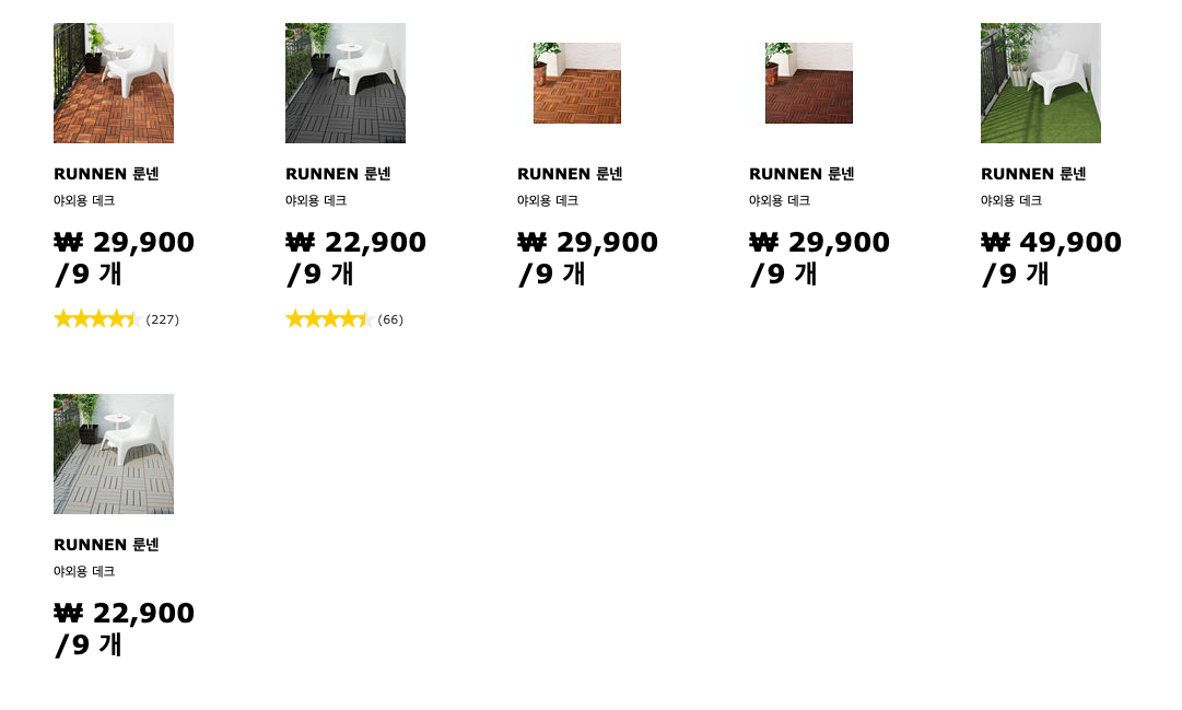 야외용 데크라는 분류로 총 6 가지의 룬넨 시리즈 조립 식 발판을 판매하다. 인조 잔디형 발판도 있는 것을 확인할 수 있다. 이케아는 외형이 조금 달라도 이름이 같으므로 주문 전에 확인이 필수다.