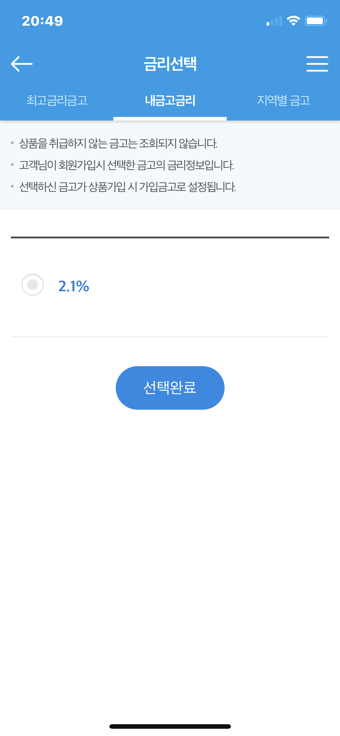 우대이율을 확인하고 [상품가입]을 누르면 "금리선택" 화면이 나오며, "내금고금리" 항목에서 본인이 조합원으로 가입된 지점을 확인할 수 있다. 내가 가입한 지점은 현재 2.1% 이율 상품을 판매하고 있다.