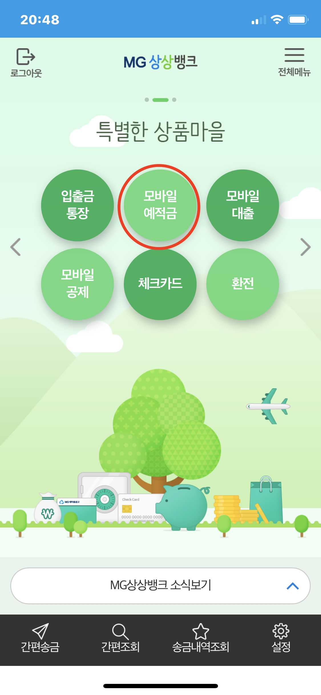 MG상상뱅크 메인 화면에서 [모바일 예적금] 버튼을 누르면 오른쪽과 같이 예금과 적금의 최고 금리를 간단히 확인할 수 있다. 이 중 상상모바일정기예금의 [자세히 보기] 버튼을 클릭한다.