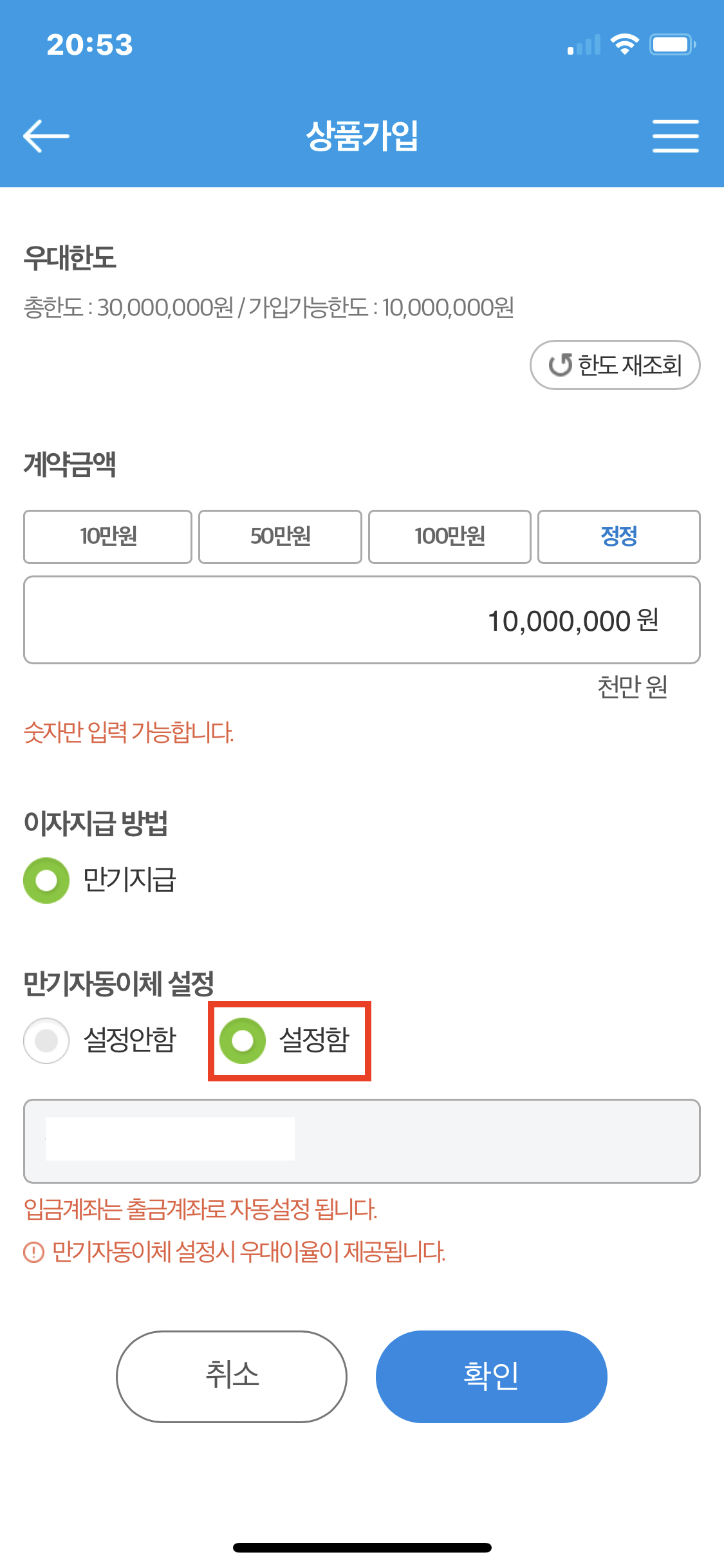 모든 가입 내용을 설정한 후 하단에 만기자동이체 설정에서 [설정함]을 선택해야만 우대이율 0.05% 받아볼 수 있다.