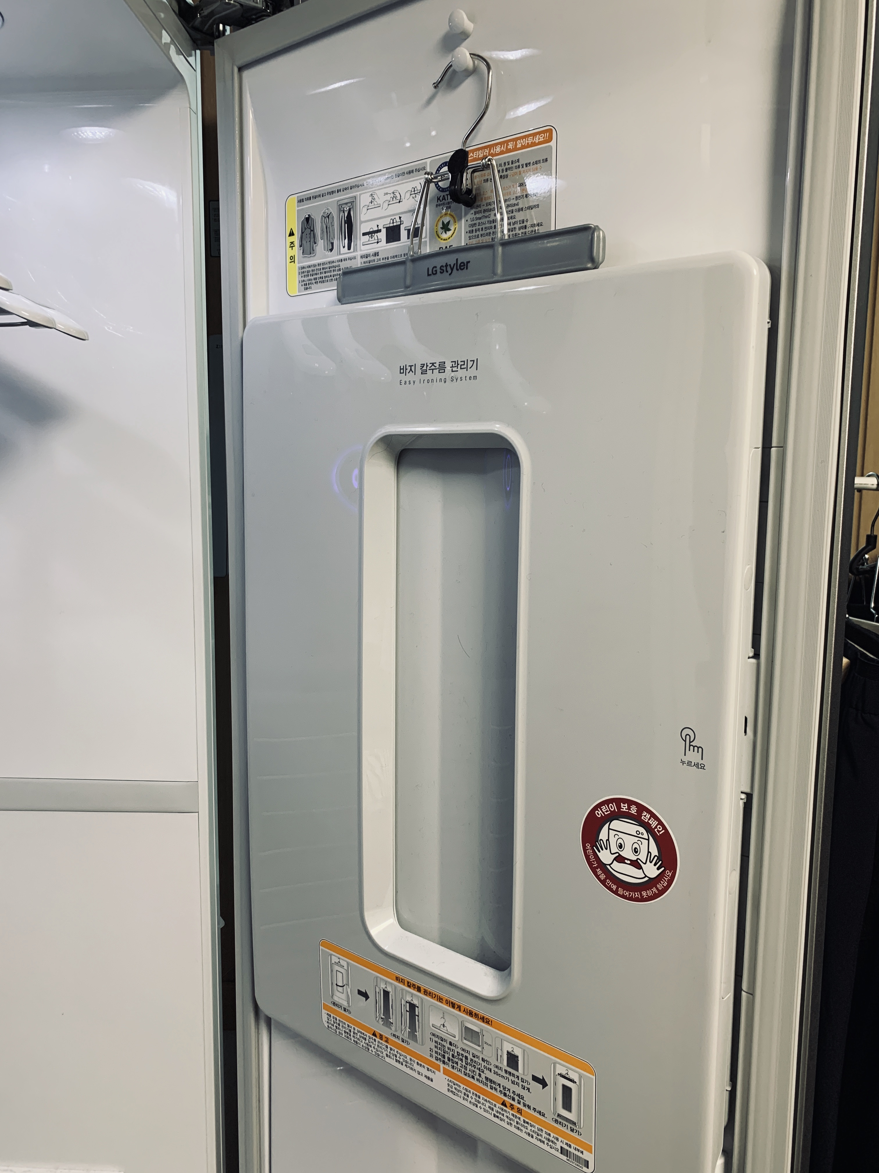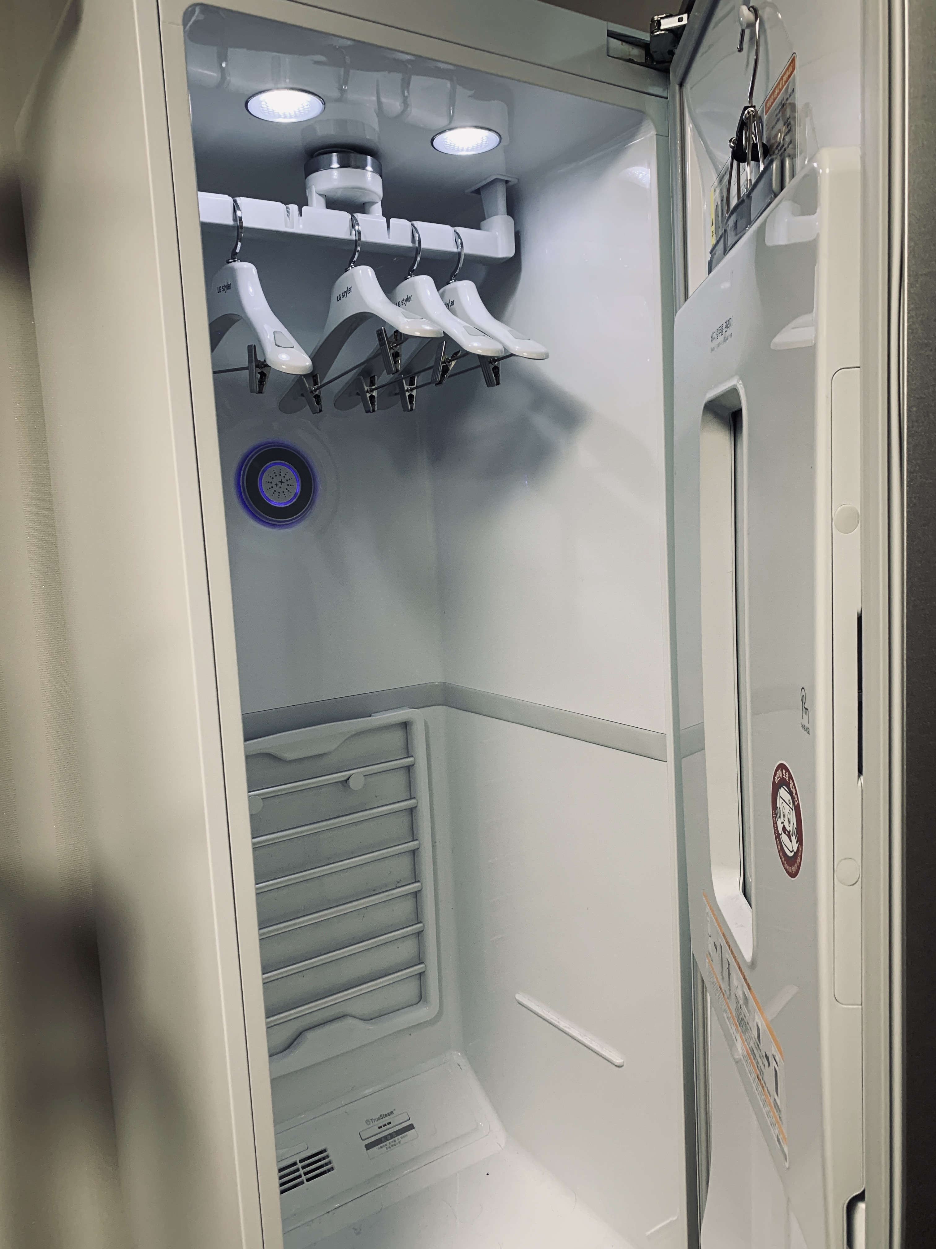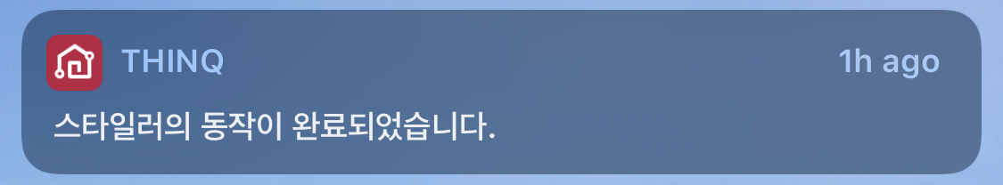코스가 완료되면 핸드폰으로 알람이 뜬다. 스타일러는 식기세척기와는 다르게 코스 완료 후 오픈이 되지 않는다. 열어놓지 않아도 괜찮을 순 있지만 뜨거운 기운을 빼내야 좀 더 뽀송한 것 같아서 되도록이면 열어 놓는다.