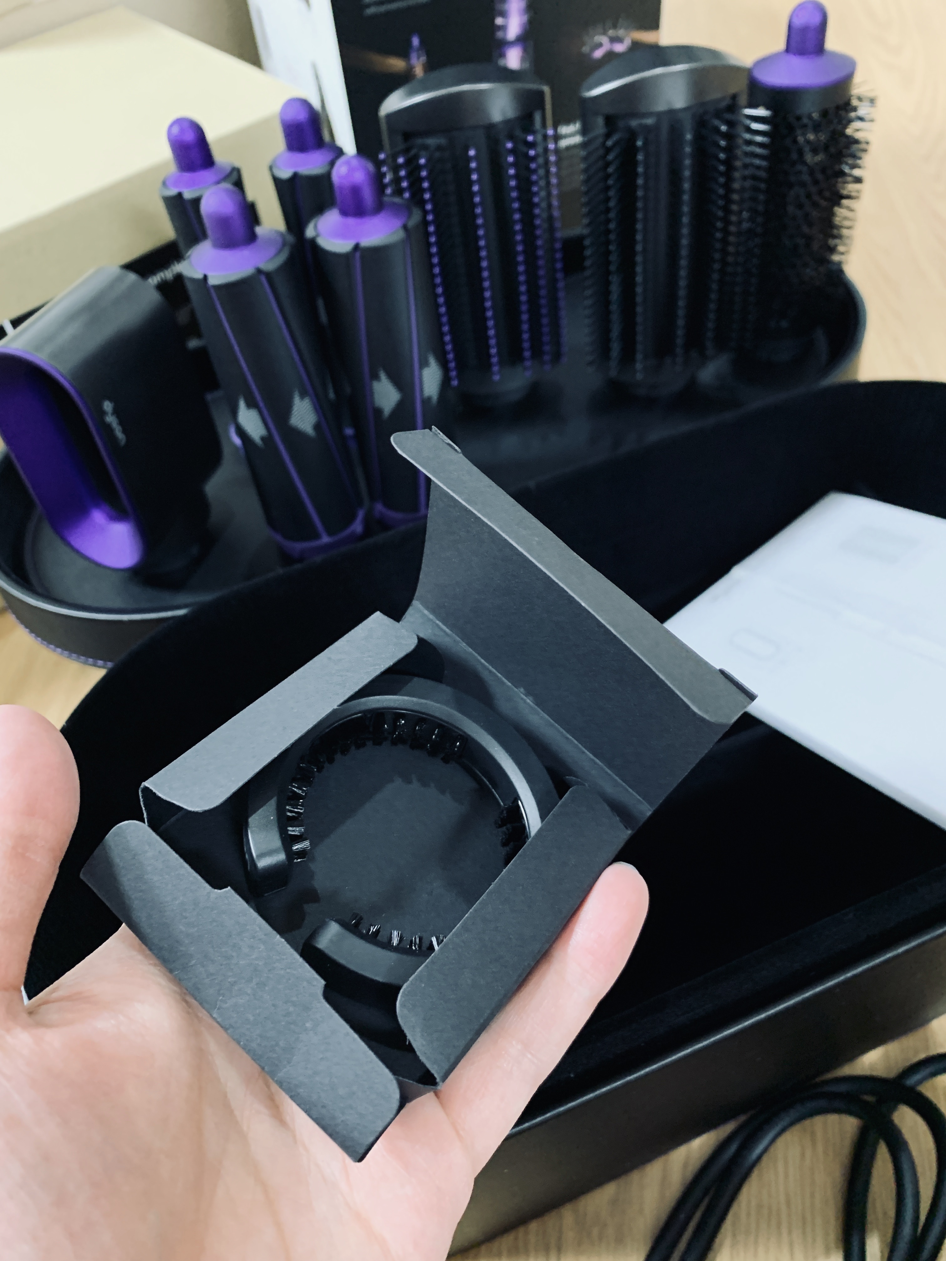 밤이라 애꿎은 프리스타일링 드라이어 툴만 끼워 동작해보았다. 소리가 아주 차분하고 머리에 닿는 바람도 부드럽다. 내일 출근할 때 한 번 써봐야지. 며칠 사용해보면서 느낀 점을 정리해봐야겠다. 이것으로 내돈주고산 다이슨 에어랩 컴플리트 블랙/퍼플 언박싱 끝 :)