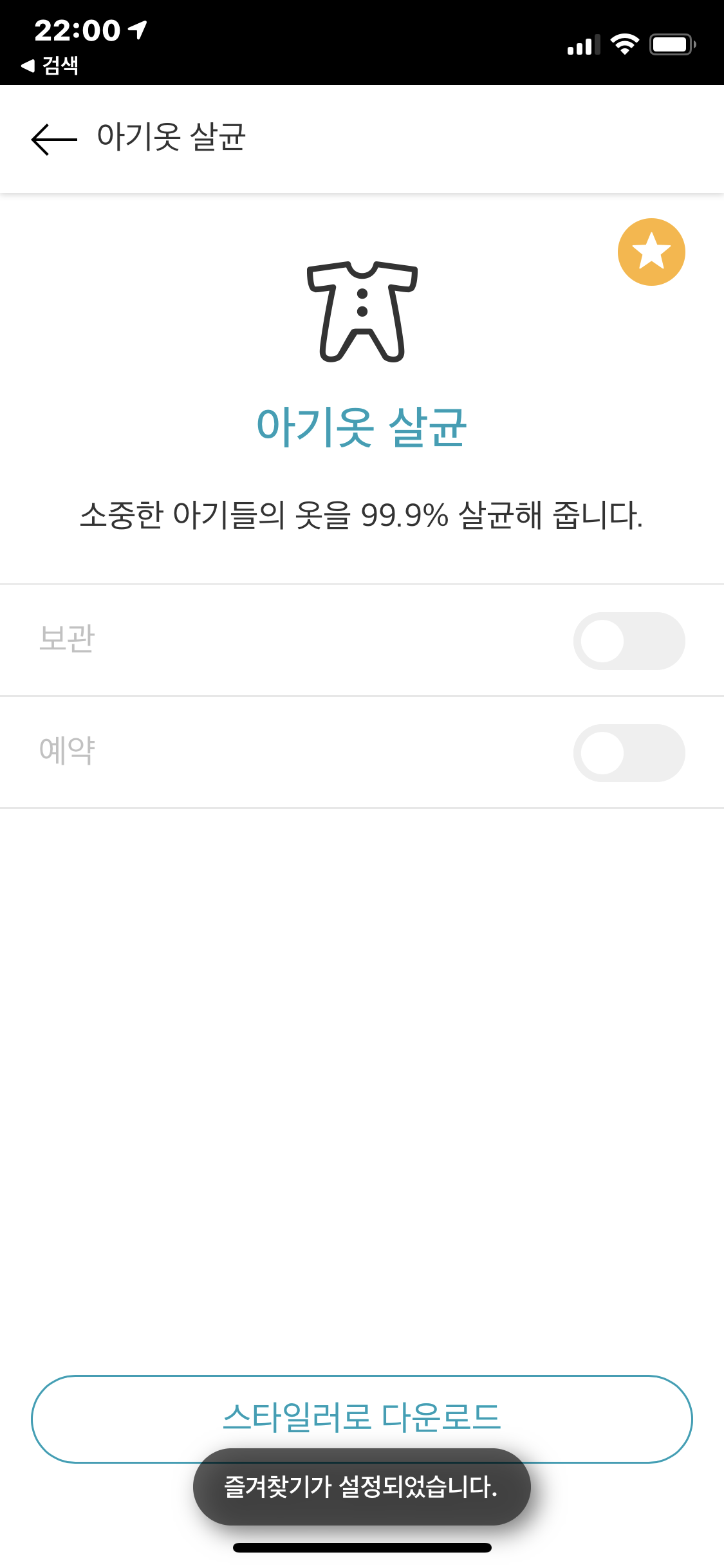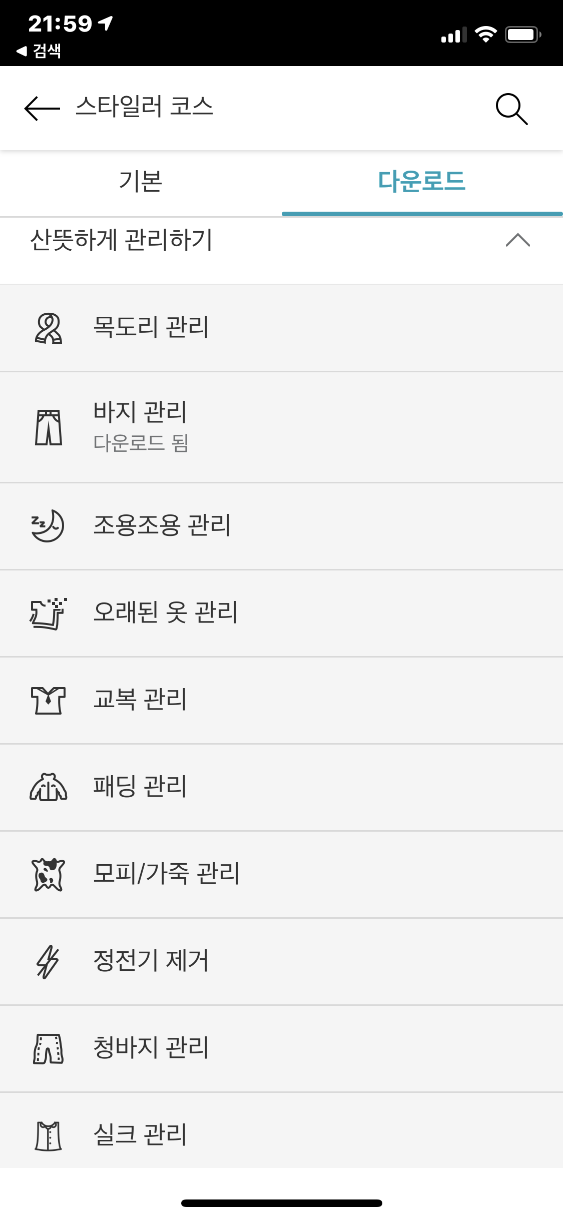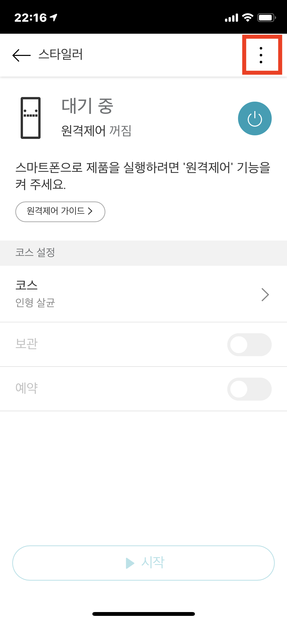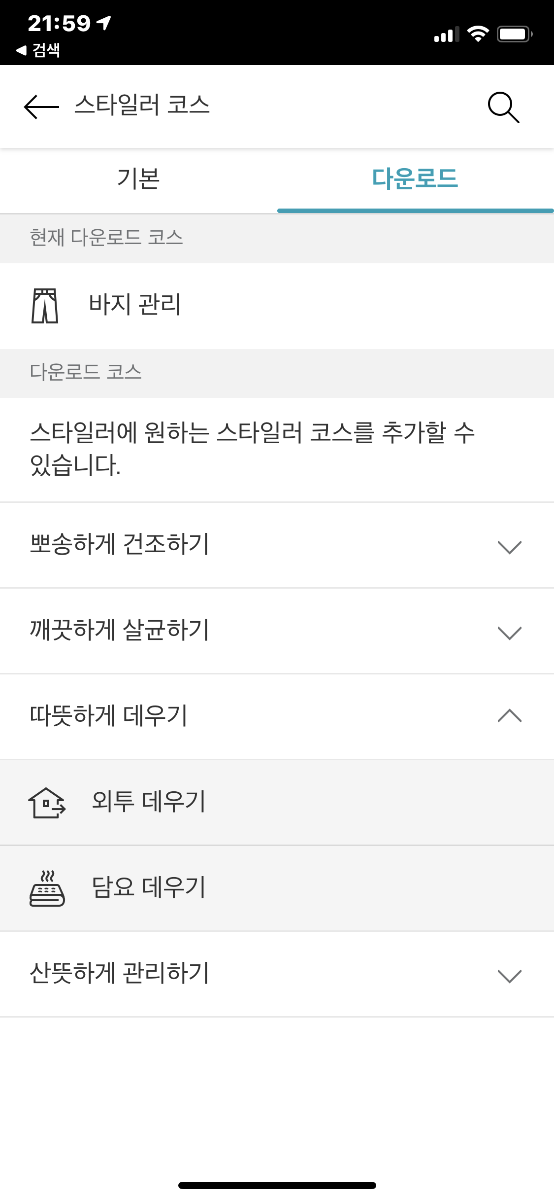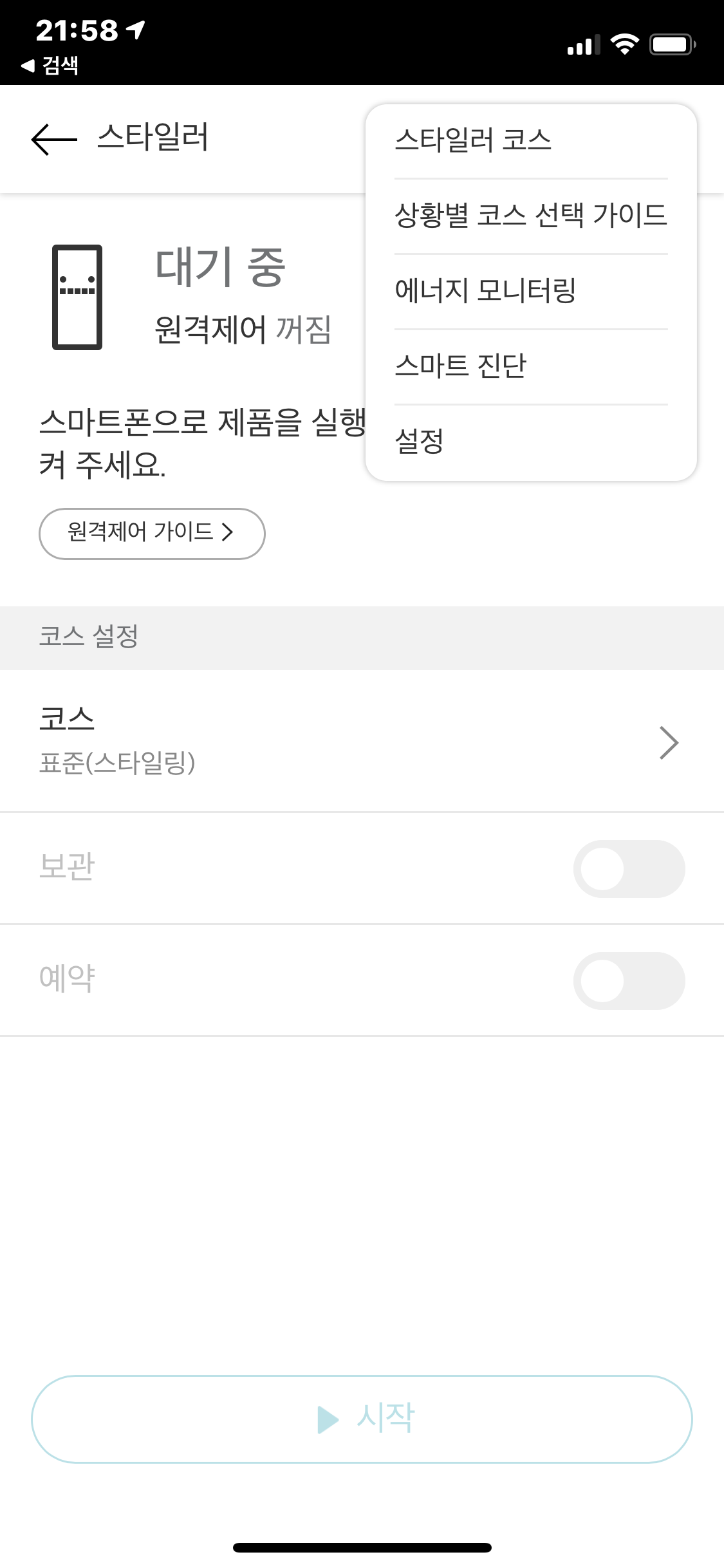 [스타일러로 다운로드]를 누르면 다운로드가 진행되고 준비가 완료되면 [시작] 버튼이 나타난다. 다운로드는 한 가지 코스만 가능하다. 시작을 누르면 스타일러에 자동으로 세팅이 되니 스마트폰에서 선택을 해주는 것이 편하다.