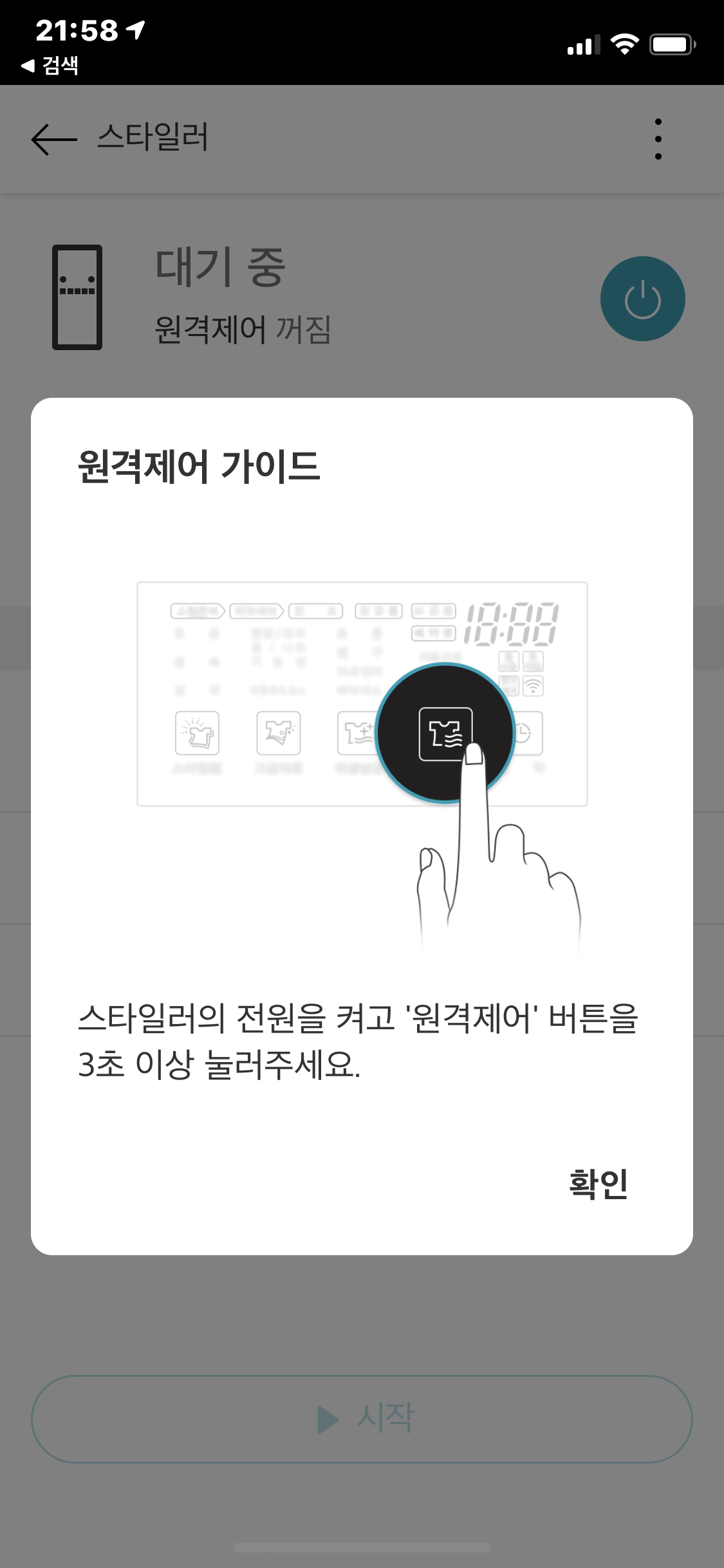 일단 연결이 되면 다음과 같은 화면을 볼 수 있다. 현재 스타일러는 켜놓은 상황이라 대기 중으로 표현된다. 원격제어를 위해서는 스타일러에서 '원격제어' 버튼을 눌러주어야 한다고 하는데, 많이 사용은 안 하게 된다.