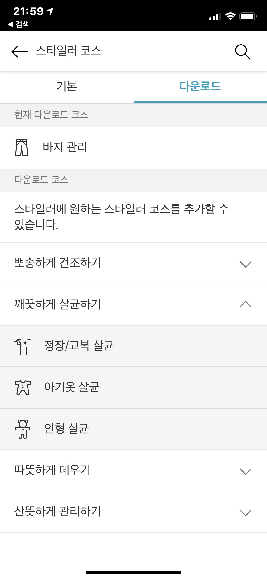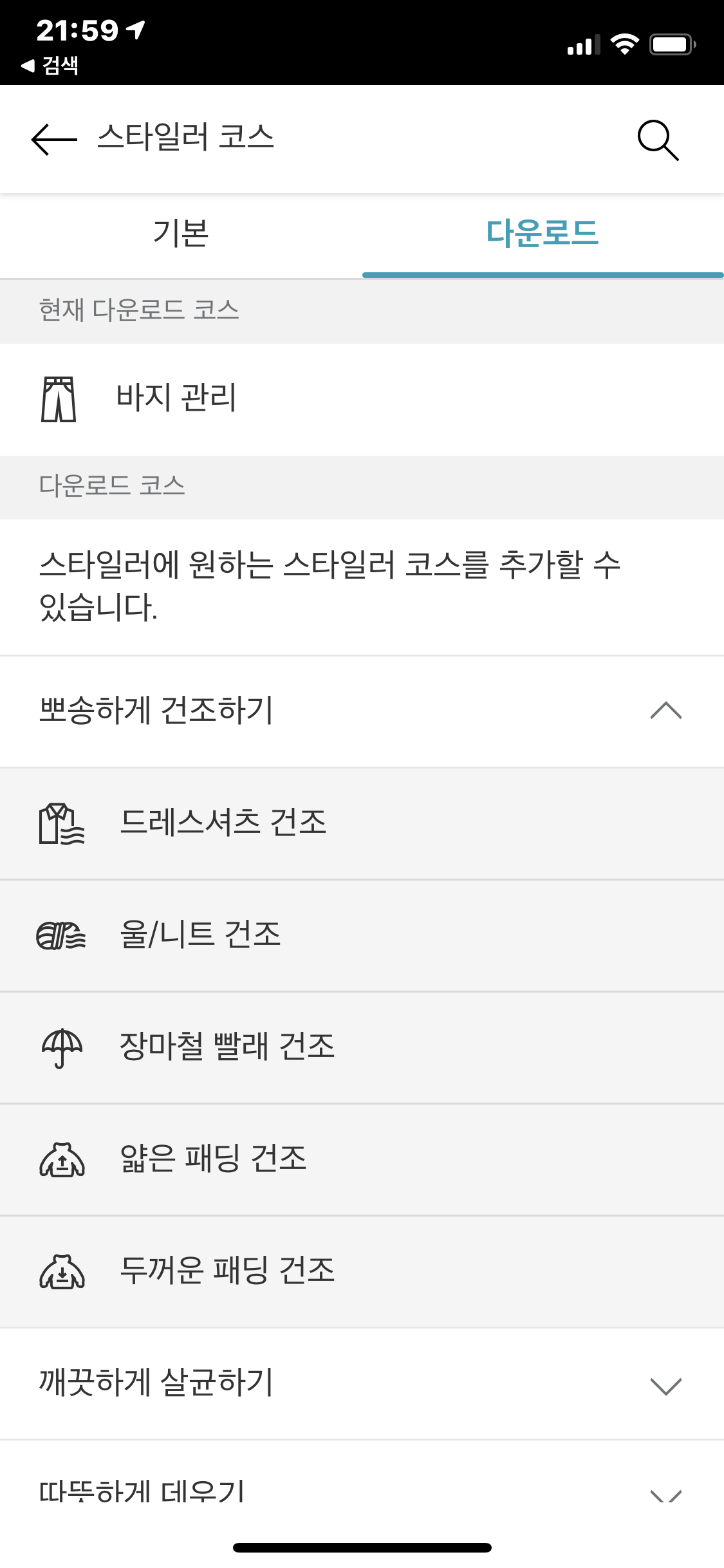 다운로드 코스에는 [뽀송하게 건조하기], [깨끗하게 살균하기], [따뜻하게 데우기], [산뜻하게 관리하기] 네 가지가 있다.