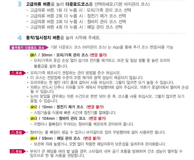 [산뜻하게 관리하기]는 코스가 굉장히 많다. 목도리 관리도 보이고, 오래된 옷 관리도 보인다. 모피/가죽 관리, 실크 관리 코스도 있는데 이번 블로그를 하면서 처음 확인하게 됐다. 집에 있는 가죽 잠바는 기본 코스의 [고급> 외투]로 주로 돌려 입었었는데 이거보다 가죽에 특화된 코스인 것 같다.