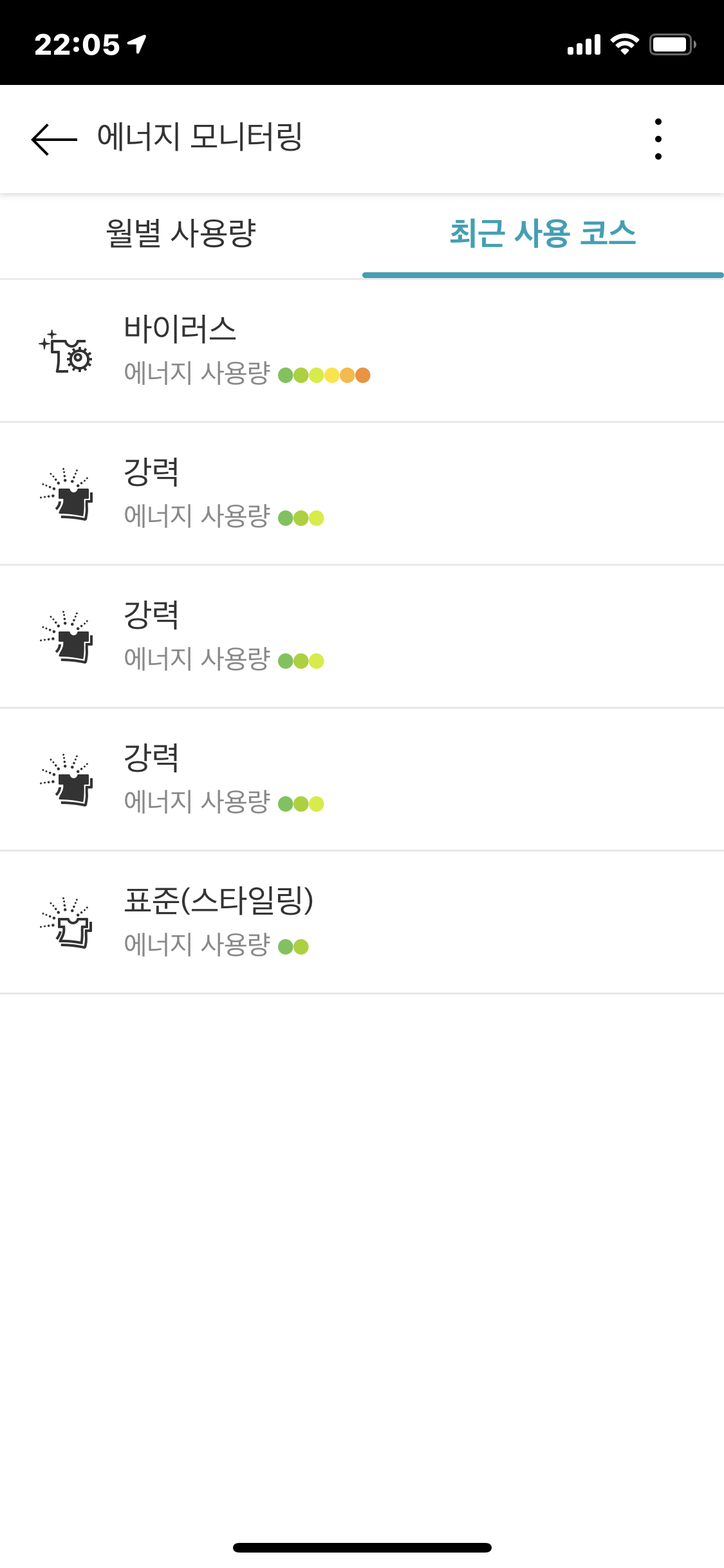 [최근 사용 코스]를 누르면 최근에 사용한 코스와 각 코스별 에너지 사용량이 표시되어 있는데 바이러스 코스는 에너지 6칸이 꽉 차 있다. 확실히 열 일하면서 없애주는 건가. 믿고 계속 써봐야지 코로나에 별 수 있나.