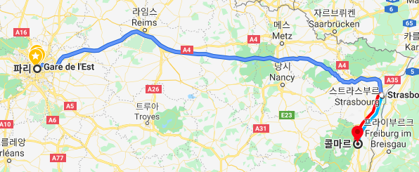 콜마르로 갈 때 스트라스부르를 거쳐가기도 하고, 아니면 돌아올 때 스트라스부르에 들렀다가 올 수도 있는 루트다. 기차를 이용했는데, 기차마다 시간 차이는 있겠지만 보통 편도 2시간 (파리-콜마르) 정도로 생각보다 빠르게 이동할 수 있어서 당일치기로도 이용하기 괜찮았다.