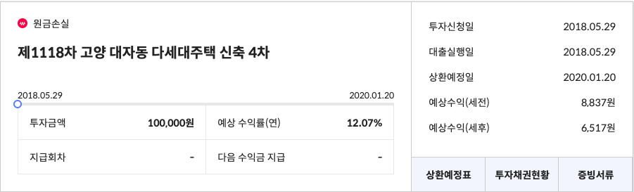 총 46건의 투자가 진행되었으며, 이 중 43건은 A등급, 3건은 B등급 투자다. 2018년도 초기에는 수익률에 눈이 가 10% 넘어가는 상품에 투자를 진행했었다. 이 중 1 건에서 손실이 발생했는데, 그 상품은 아래와 같다.