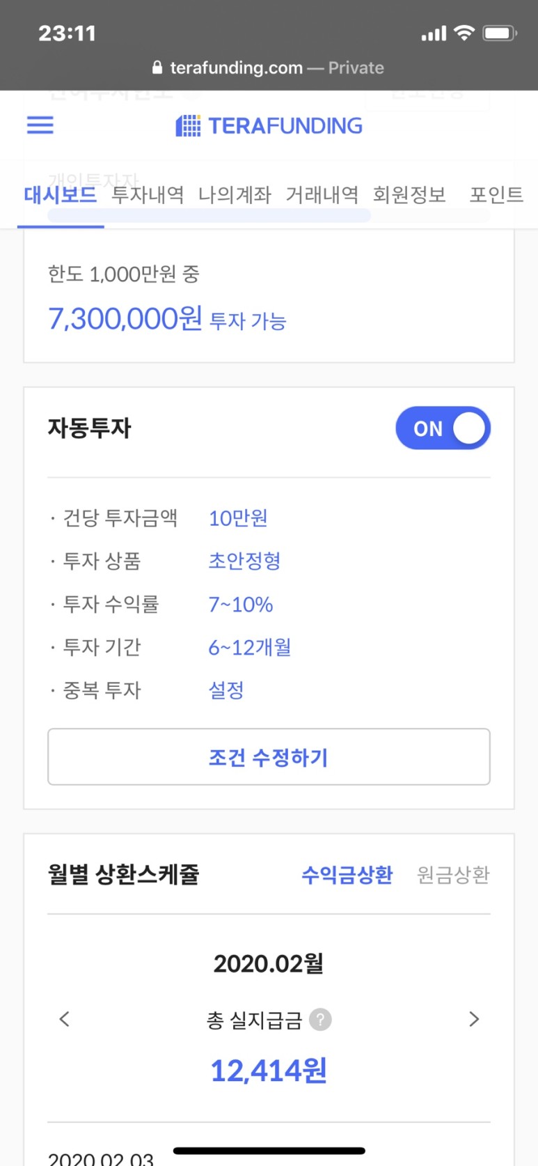 초안정형 담보 대출의 경우 7-10% 범위에서 상품이 나오고 있다. 이와 같은 조정과 함께 테라펀딩에서만 매달 10만 원씩 투자를 진행하였고, 투자액이 조금씩 증가하여 현재는 한 달에 12,000원 정도 (세후 약 6% 정도의 연수익)의 예상 수익이 나오고 있다. 지금은 안정적으로 순항 중이다.