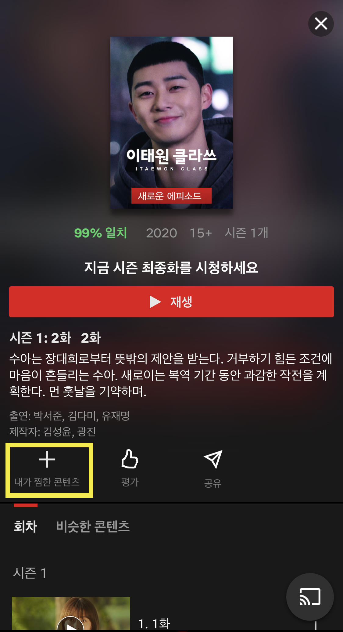 [이태원 클라쓰]를 클릭하면 박새로이 얼굴이 보인다. [+ 내가 찜한 콘텐츠]를 눌러 놓으면 메인화면에서 좀 더 쉽게 이태원 클라쓰를 만나볼 수 있다.