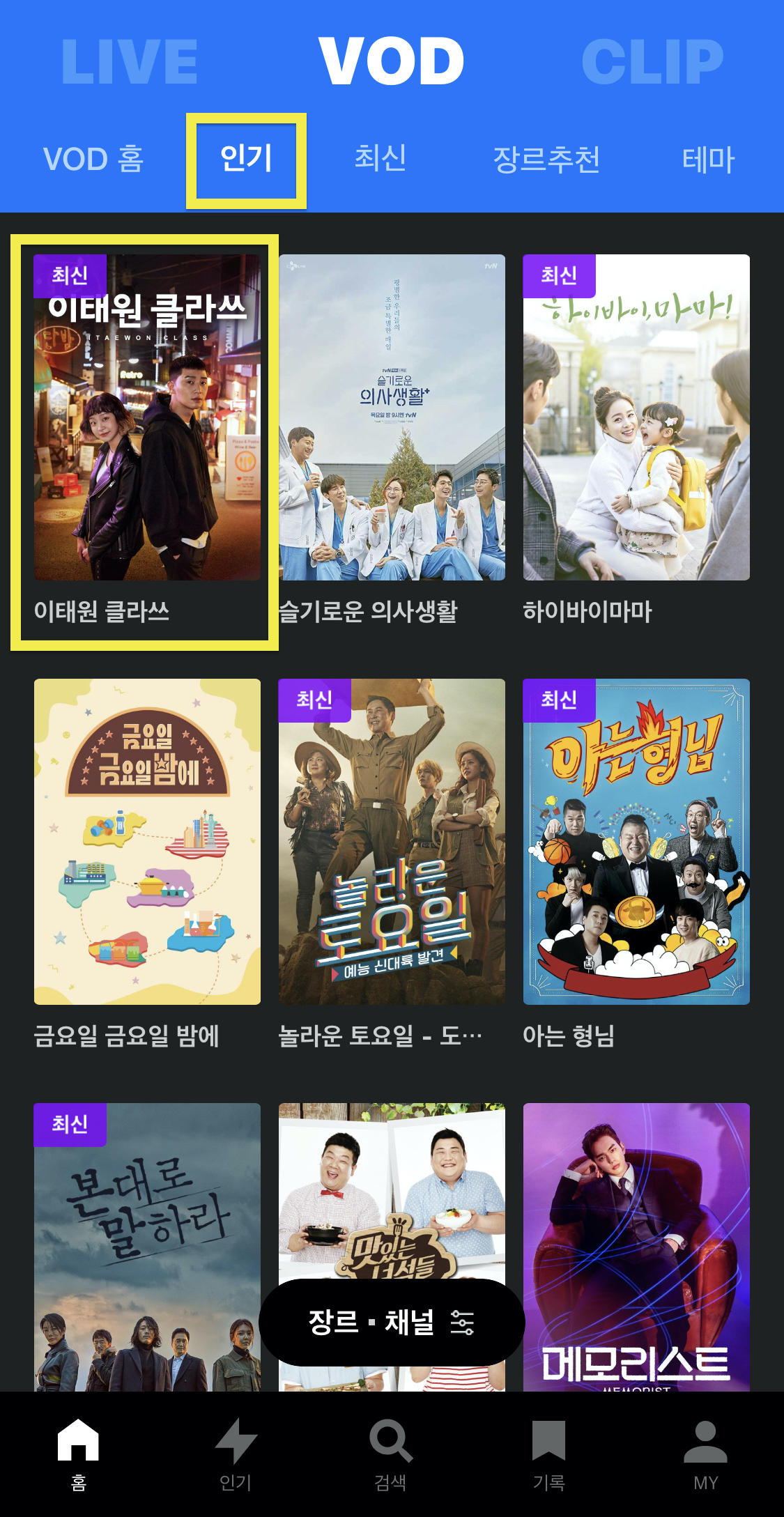TVING에 접속하면 [VOD - 인기]에서 이태원 클라쓰가 있는 것을 확인할 수 있다.