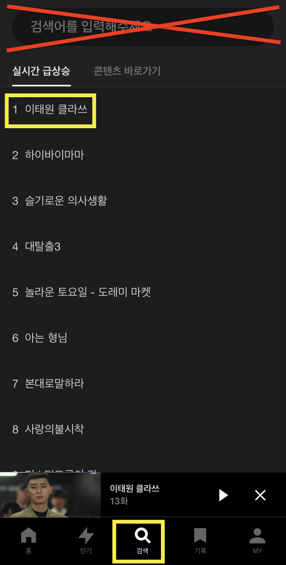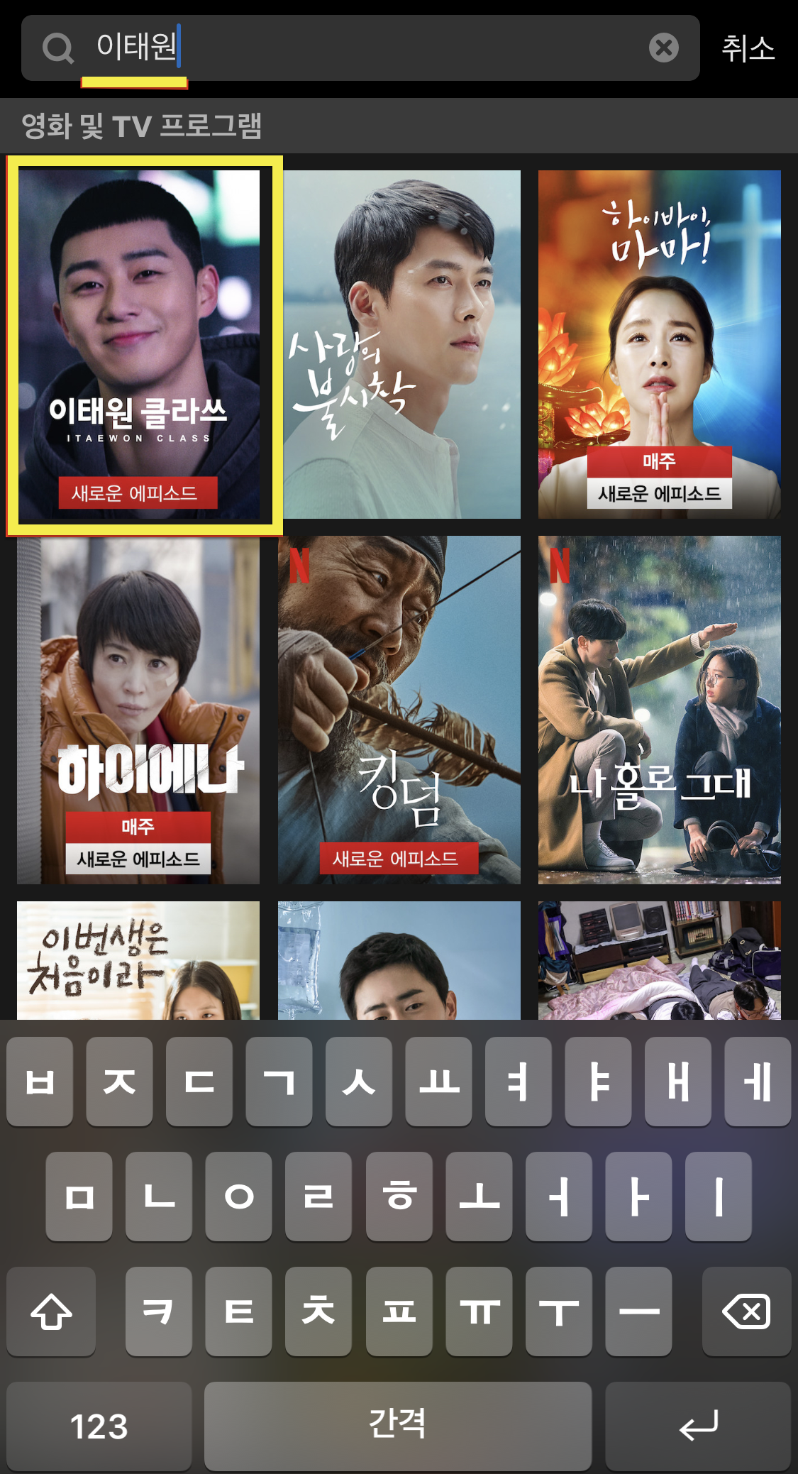 [검색] 화면에서 "이태원"만 입력해도 콘텐츠를 바로 확인할 수 있다.