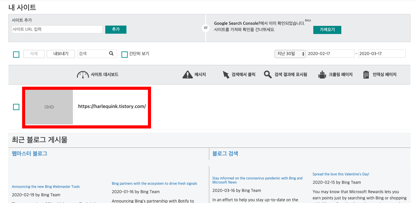 다시 bing 웹마스터 도구 화면에 접속하면 방금 등록한 사이트를 확인할 수 있다. [등록된 티스토리 사이트]를 눌러줍니다.