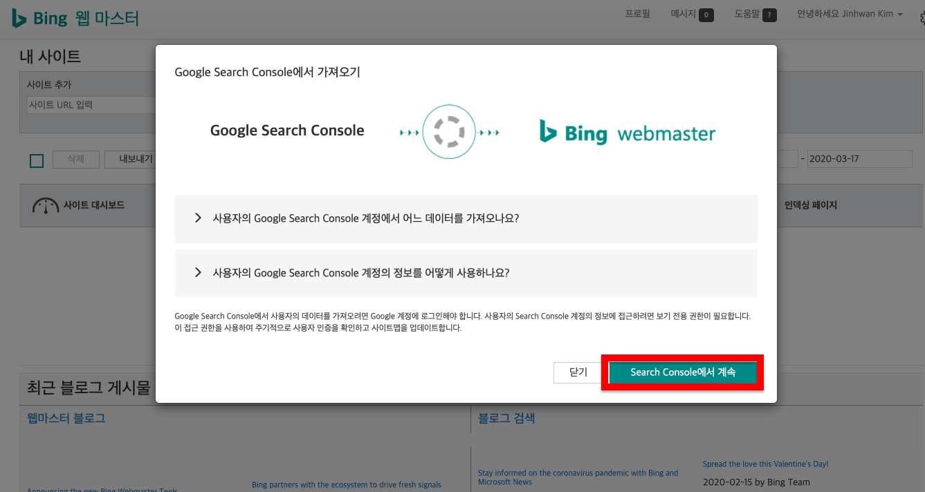 Google Search Console에서 가져오기 화면이 나오면 [Search Console에서 계속] 버튼을 누른다.