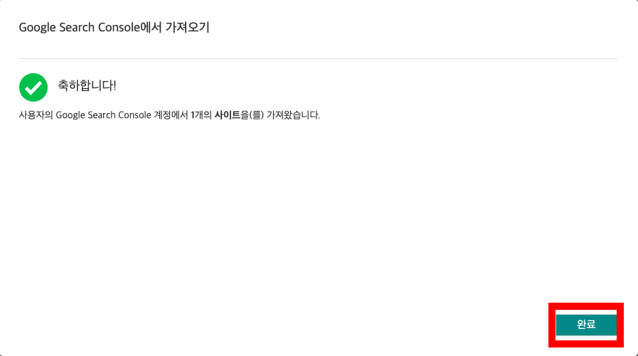 이제 모두 완료입니다. Google Search Console 계정에서 사이트 가져오기 완료 축하 메시지가 나타납니다. [완료] 버튼을 눌러줍니다.