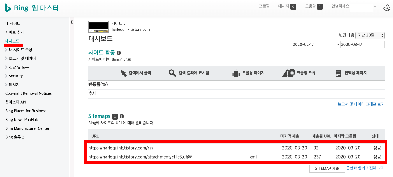 Bing 웹 마스터 대시보드 화면이 나타난다. Sitemaps 세션에서 이전에 등록된 sitemap과 rss 등록이 잘 되었는지 확인할 수 있다. 바로 제출할 시 상태는 보류라고 나타날 수 있다. 필자의 경우 몇 분 안되어 성공으로 상태가 변경되었다. 해당 상태는 늦어도 수 일 내에 성공으로 변경되니 수 일이 지나지 않으면 상태가 성공으로 변경되지 않으면 다시 등록을 시도해 보길 바란다.