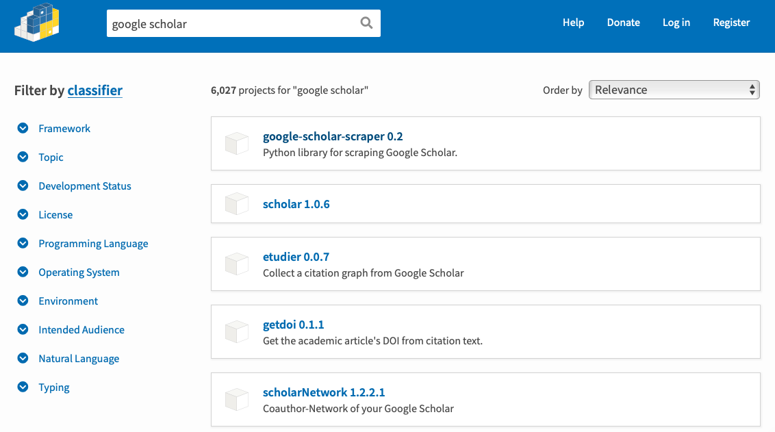 Google Scholar라고 검색해 보았다. 총 6천개가 넘는 프로젝트가 존재하며 여기서 원하는 패키지를 찾아야한다.
