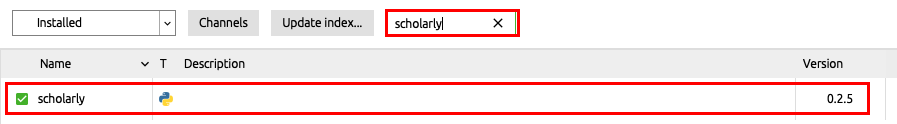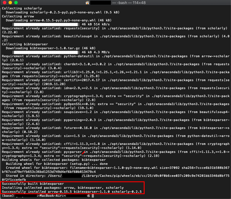 설치가 진행되는 문구가 계속적으로 출력되고 최종적으로 scholarly 패키지가 설치가 성공적으로 완료되었다는 문구를 확인할 수 있다.