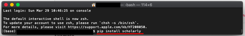 터미널이 나오면 앞서 확인한 pip install xxxxxx 를 입력하고 엔터를 누른다. 본 글에서는 pip install scholarly로 예를 들어 실행하였다.