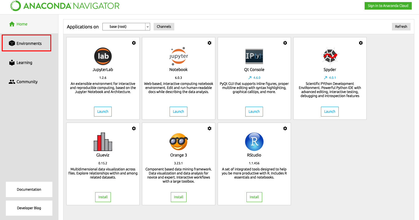 설치된 프로젝트는 ANACONDA NAVIGATOR의 Environments 항목에서 확인해 볼수 있다. Environments를 클릭한다.