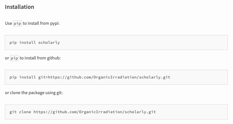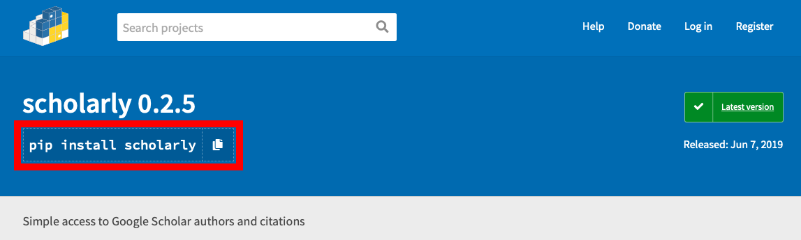 일단 패키지를 설치하기 위해 원하는 프로젝트에 들어가보자. 해당 프로젝트에 들어가면 버전과 함께 pip install scholarly 이라는 설치 문구를 확인할 수 있다. 예시로 가져온 프로젝트는 Scholarly라는 이름의 프로젝트로 Google Scholar에서 저자와 인용 횟수를 검색하는 패키지이다.