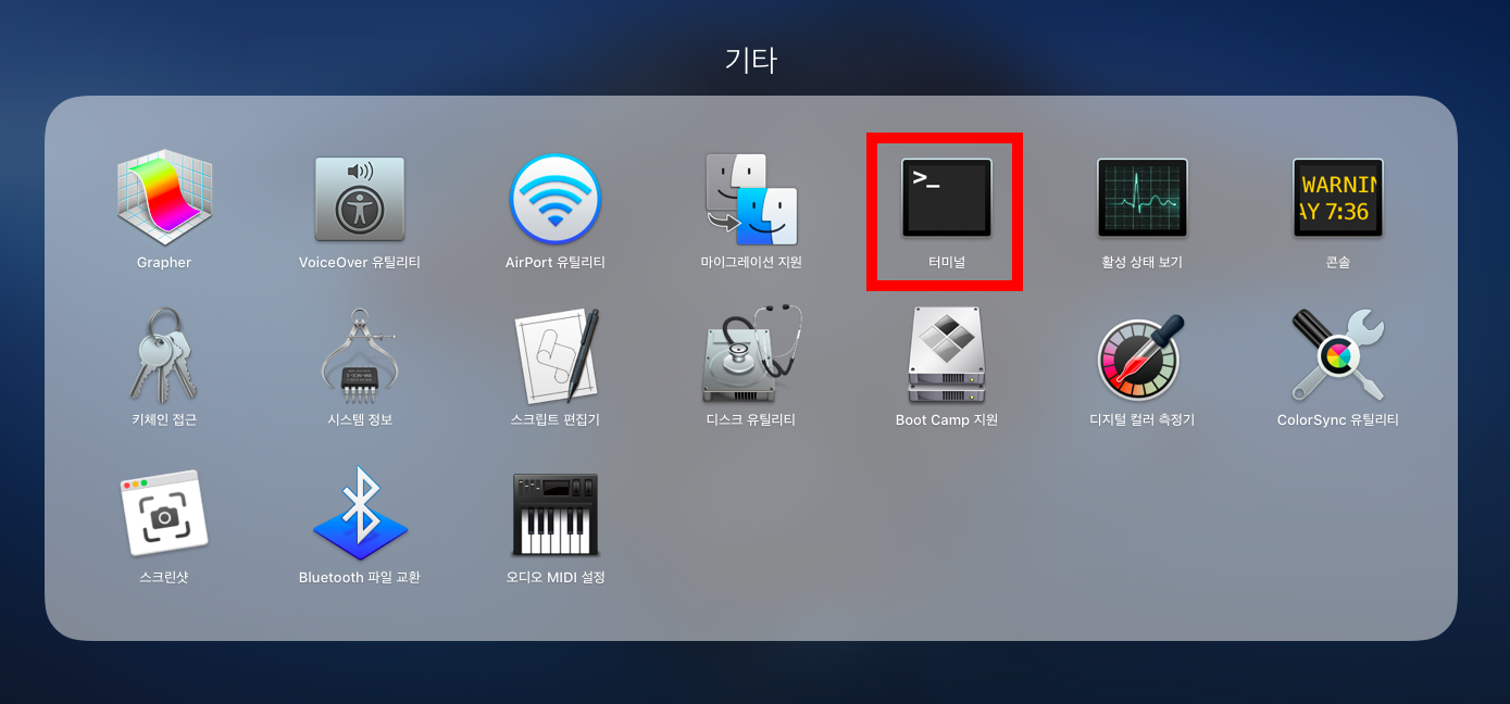 프로젝트 설치하는 명령을 확인했으면 이제 터미널(terminal)에 실행하면 된다. Launch에서 기타를 찾는다.