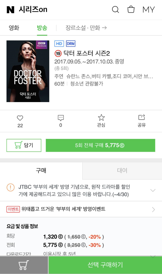 부부의 세계가 큰 인기를 누리고 있다. 2화 방영만에 11% 시청률을 기록하며 인기 드라마에 이름을 올렸다. 부부의 세계의 인기로 그 원작인 닥터 포스터에 대한 궁금증으로 올라가면서 다시 보기를 원하는 분들이 늘어나고 있다. 필자도 넷플릭스나 왓챠를 들어가 보며 혹시 제공되고 있는지 확인해보았으나 찾을 수가 없었다. 이전에는 넷플릭스에서도 제공을 하였다고 하는데 지금은 제공되지 않는단다. 그렇다면 아예 볼 수 없는 것인가? 그렇지만은 않다.