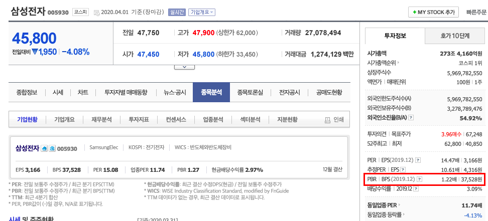 삼성 전자 종목을 예를 들어 주식 가격을 조회해보면 우측 투자정보에서 PBR과 BPS를 간단하게 확인할 수 있다. PBR이 1.22배로 주당자산보다 약간 높게 거래가 되고 있다.