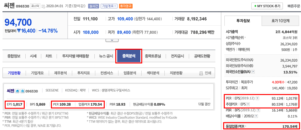 오늘자(20.04.01) 씨젠 종목을 가지고 확인해보자. 씨젠의 PER은 93.12배로 되어있다. 주당순이익 대비 주식 가격이 93.12배 나는 것이다. 이 크기를 보면 굉장히 큰 것이라고 느낄 수 있으나 동일업종의 평균 PER을 보면 170.54배가 되어있는 것을 볼 수 있다. 주당순이익은 직전년도 주당순이익으로 계산한다. 현재의 주가에 과거의 주당순이익을 반영한다니 딱 봐도 먼가 한계가 있어 보인다. 이를 개선하기 위해 도입되는 게 추정 PER이다. 과거의 정보가 아닌 추정 순이익이 반영되는 것이다. 씨젠의 경우 추정 순이익이 작년보다 더 클 것으로 기대하면서 추정 PER이 작아진 것을 볼 수 있다.