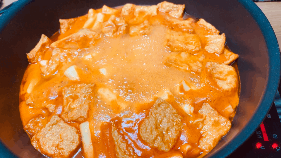 휘휘 저어서 기다려주면 1차로 끓는다. 이렇게만 해도 금방이라도 하나 찍어 먹고 싶은 냄새가 나기 시작한다. 이때부터 5분 정도 대기를 한다. 간편 음식은 주로 식탁에서 1구짜리 인덕션으로 끓여먹는데 센 불로 해도 국물이 졸지 않는다.