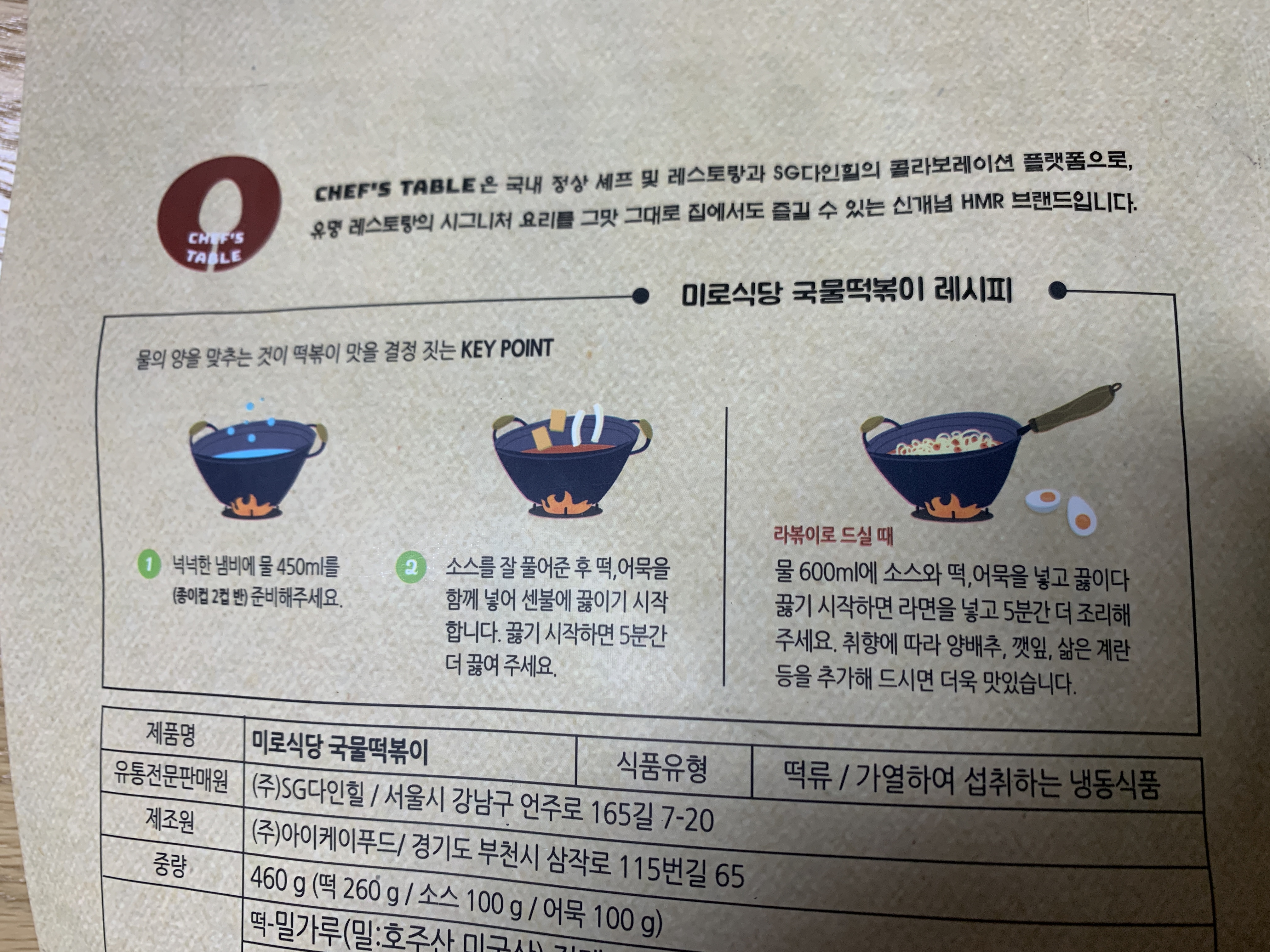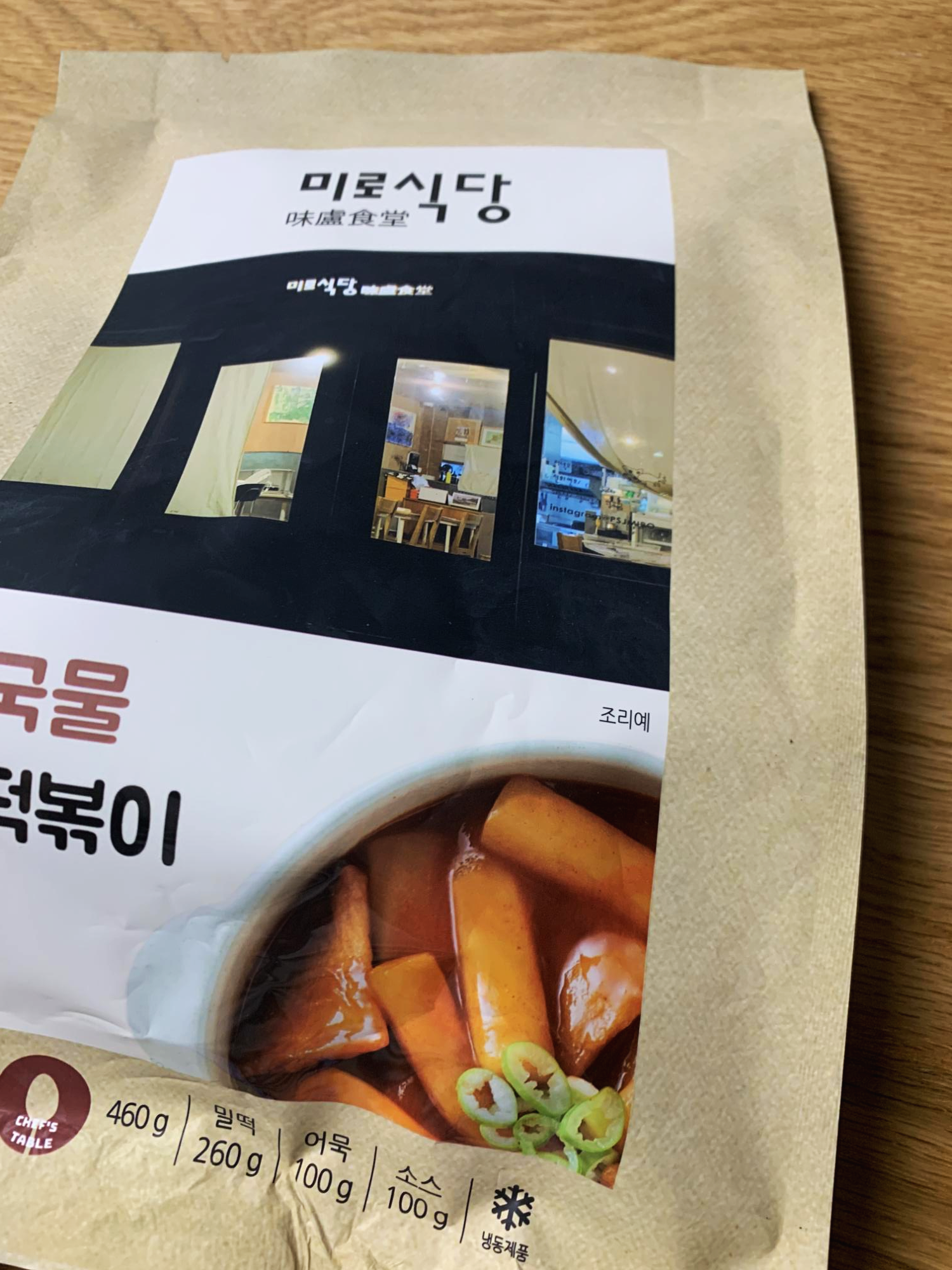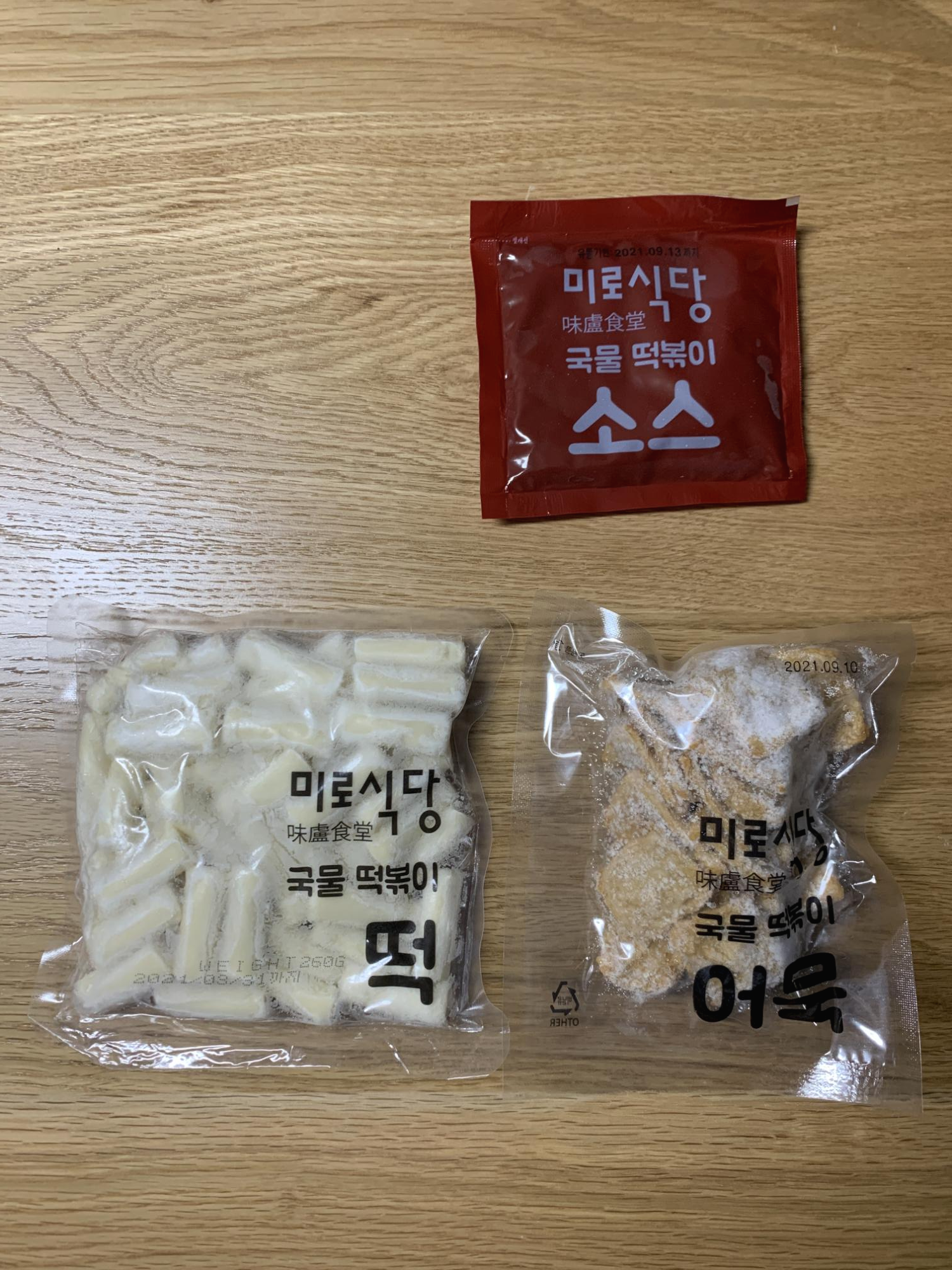 냉동인 상태로 배달이 온다. 스티로폼에 잘 얼려 배달된다. 바로 냉동실에 보관해서 먹고 싶을 때 먹는다. 내용물은 총 460g이다. 밀떡 260g, 어묵 100g, 소스 100g으로 구성되었다. 2인 가벼운 식사로 딱이다.
