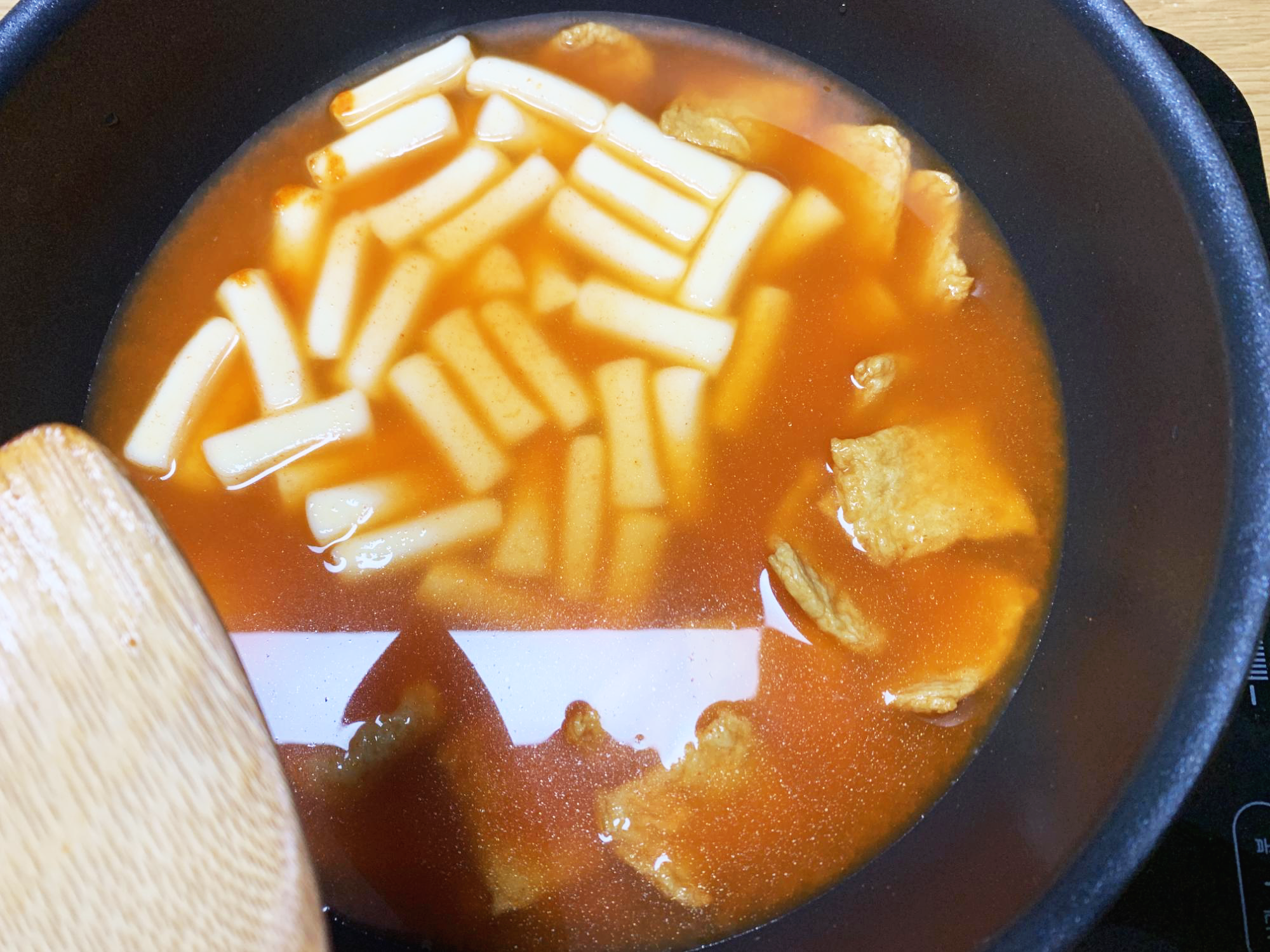 휘휘 저어서 기다려주면 1차로 끓는다. 이렇게만 해도 금방이라도 하나 찍어 먹고 싶은 냄새가 나기 시작한다. 이때부터 5분 정도 대기를 한다. 간편 음식은 주로 식탁에서 1구짜리 인덕션으로 끓여먹는데 센 불로 해도 국물이 졸지 않는다.