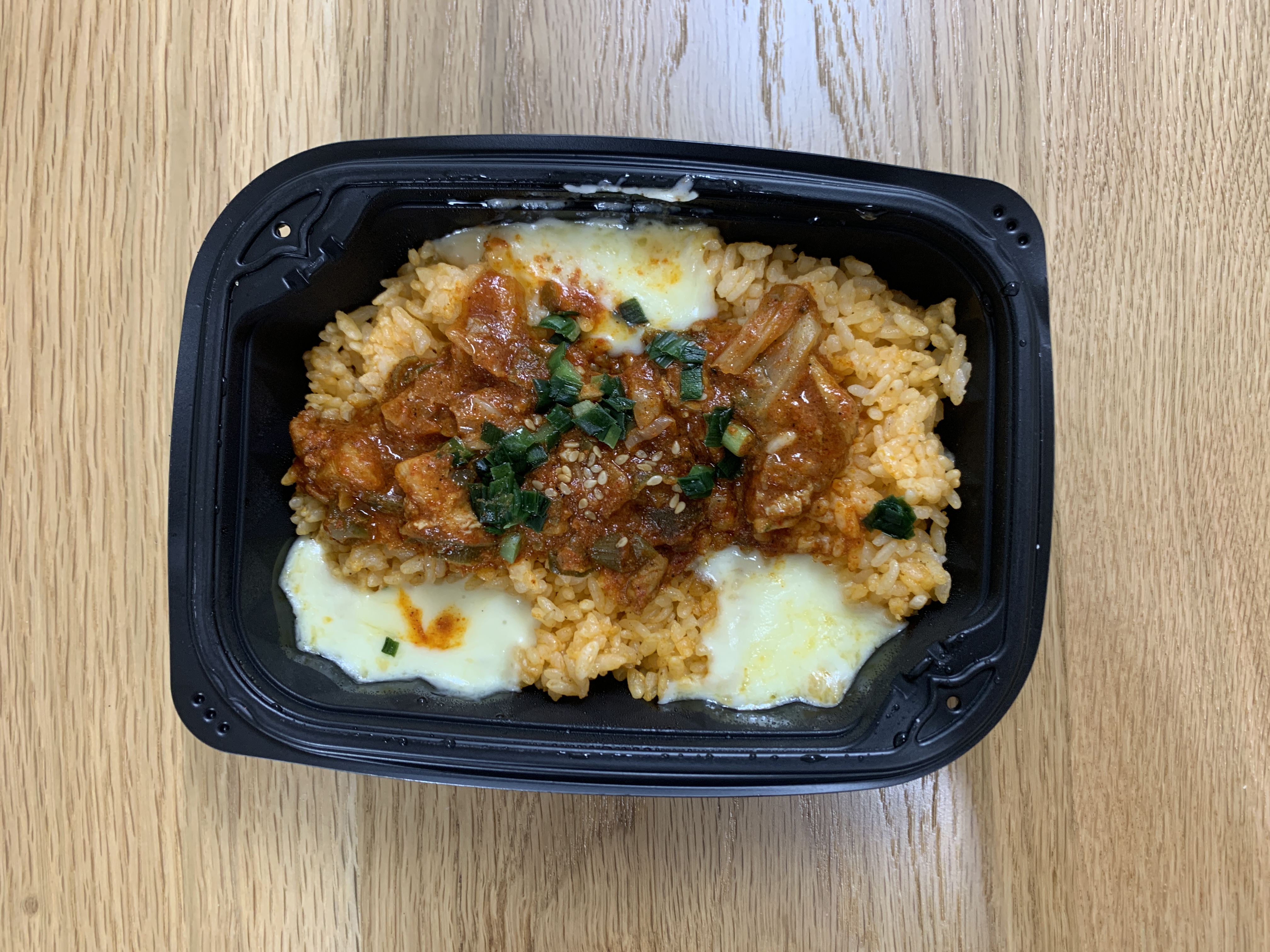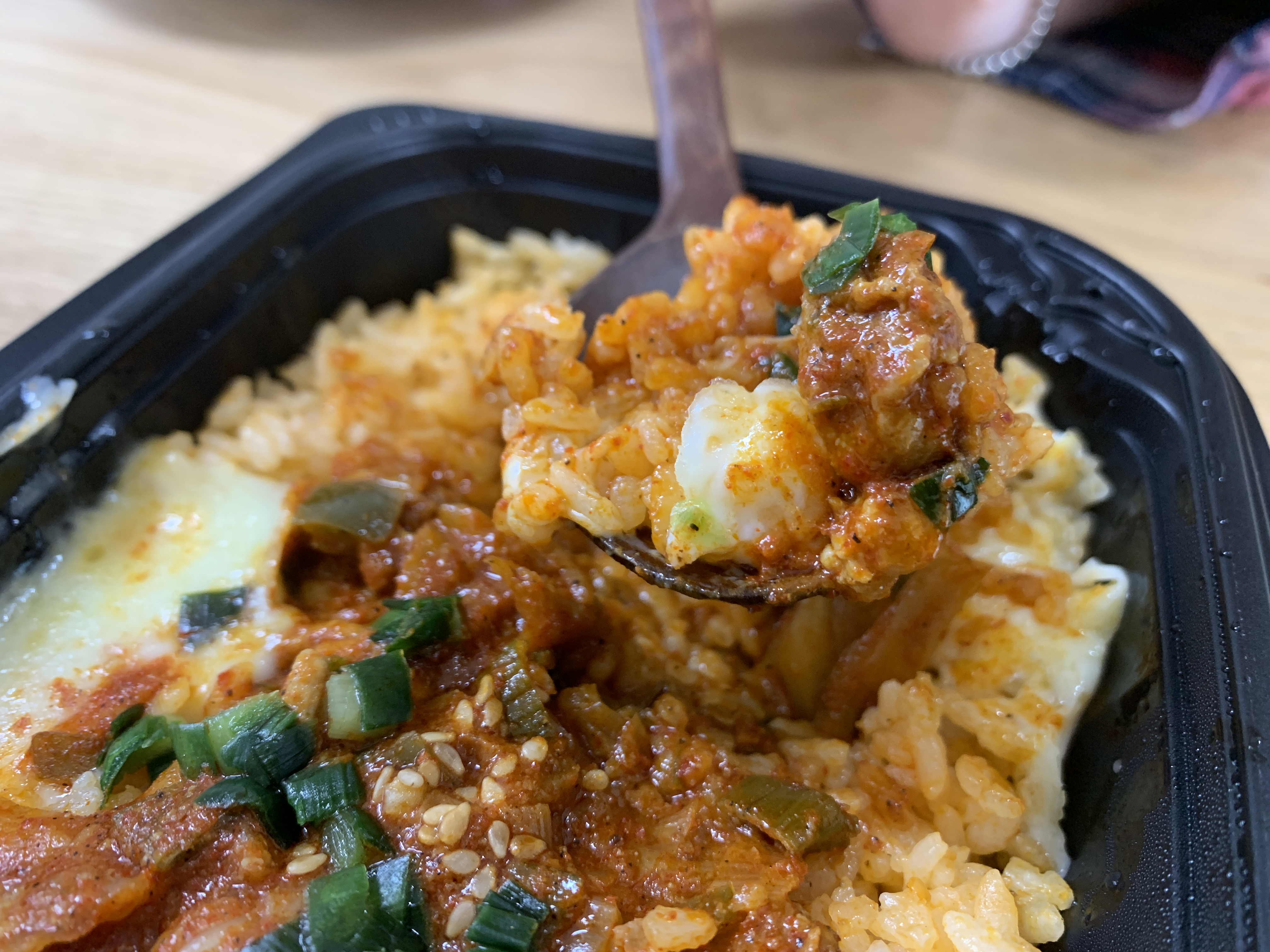 온더고 매콤불닭&치즈가 완성되었다. 큐브로 들어있는 치즈가 녹아 밥에 스며져 있는게 군침이 돈다.