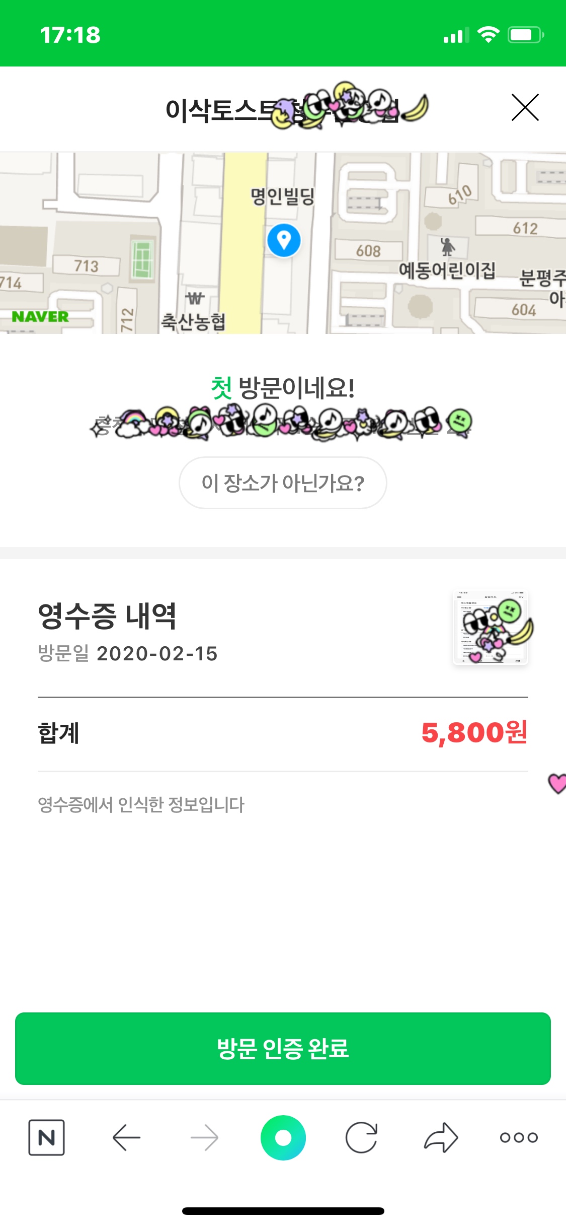 앞에서 캡처한 사진을 선택하고, [완료] 버튼을 누르면 영수증 스캐닝 후 장소가 맞는지 확인 문구가 나오네요.