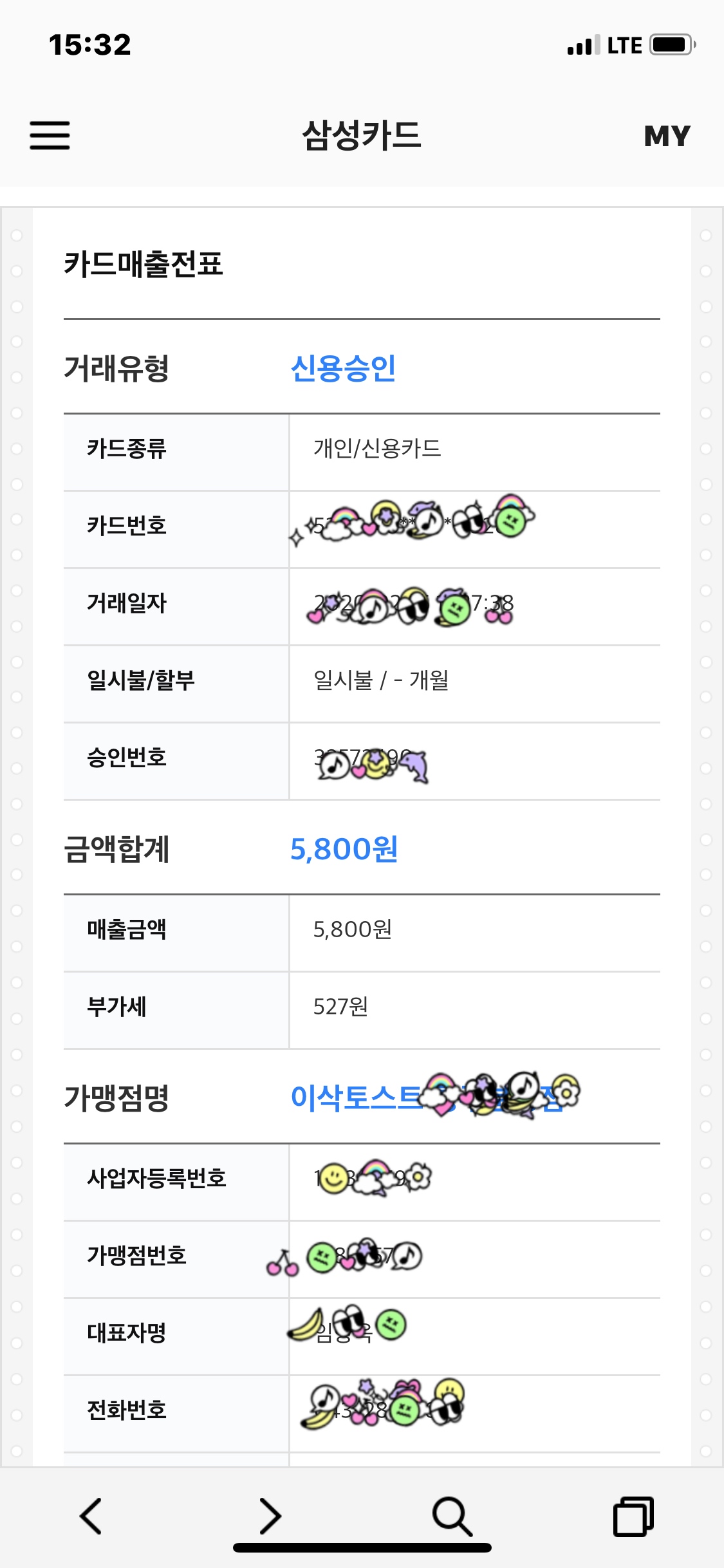 먼저 영수증을 얻어야겠죠? 제가 사용하는 삼성카드 앱에서 카드매출전표를 누르고 해당 이미지를 캡처합니다. 이왕 하는 거 여러 개의 영수증을 캡처했습니다.