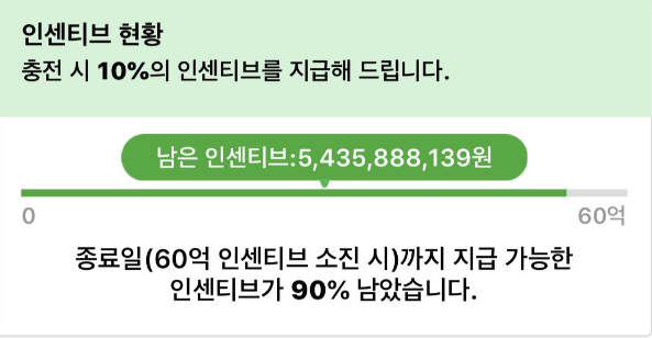 인센티브는 월 5만 원 한도이며 50만 원 충전했을 때의 기준이다. 연 34만 원까지 추가 가능하다. 소진되기 전까지는 인센티브 제공을 받을 수 있다.