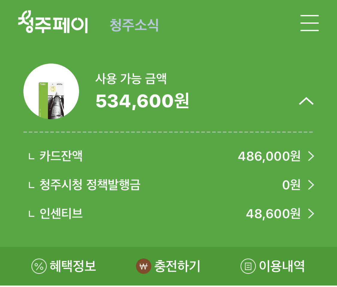 인센티브 예산은 60억으로 책정되어 있다. 4/13일 기준으로 아직 90%인 54억이 남아있다. 아직 이용하지 못한 청주 지역민들도 충분히 이용 가능하다.