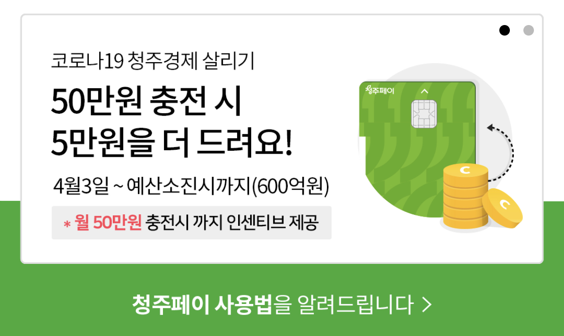 지역경제 살리는 청주시 지역화폐 [청주페이] ▶청주페이란? 충청북도 청주시의 지역화폐로, 우리 지역 내에서 돈이 돌게 하여 소상공인의 매출액 증대와 지역경제 활성화에 기여합니다. 충전식 선불카드 형태의 지역화폐로, 청주시 내에서 사용할 수 있습니다. 또한 청주시민에게 복지 수당을 지급하는 수단으로, 지역경제 활성화를 위해 충전 시 인센티브를 제공합니다. ▶카드 형태의 편리한 청주시 지역화폐, 청주페이 카드 신청 및 사용 - 복잡한 계좌 개설이나 은행 방