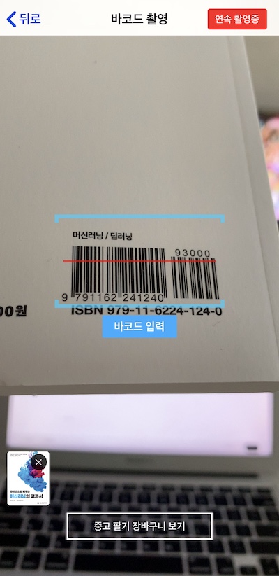 우측 상단에 [연속 촬영하기] 버튼을 클릭한다. [연속 촬영중]이라고 바뀌면 책 바코드에 카메라를 가져가는 즉시 하단에 책이 하나씩 추가된다. 모두 완료하면 [중고 팔기 장바구니 보기]를 클릭한다.