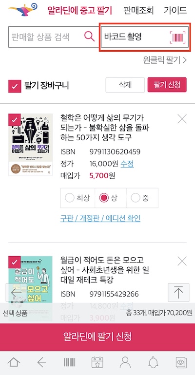알라딘에 중고 팔기 화면이 나오면 [바코드 촬영] 버튼을 클릭한다.