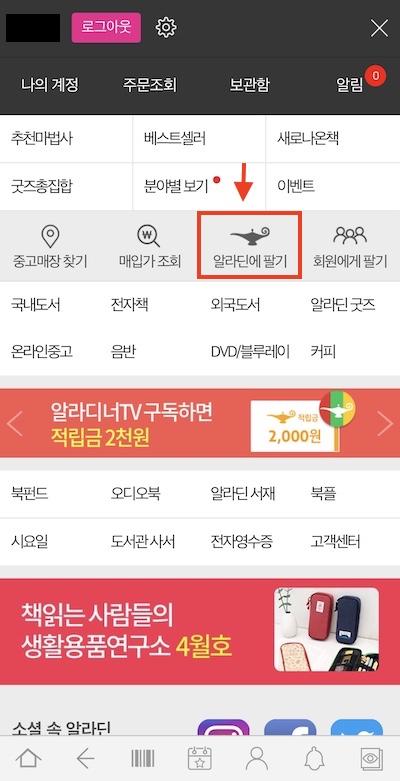 좌측 상단에 있는 삼선 메뉴에서 [알라딘에 팔기] 버튼을 클릭한다.